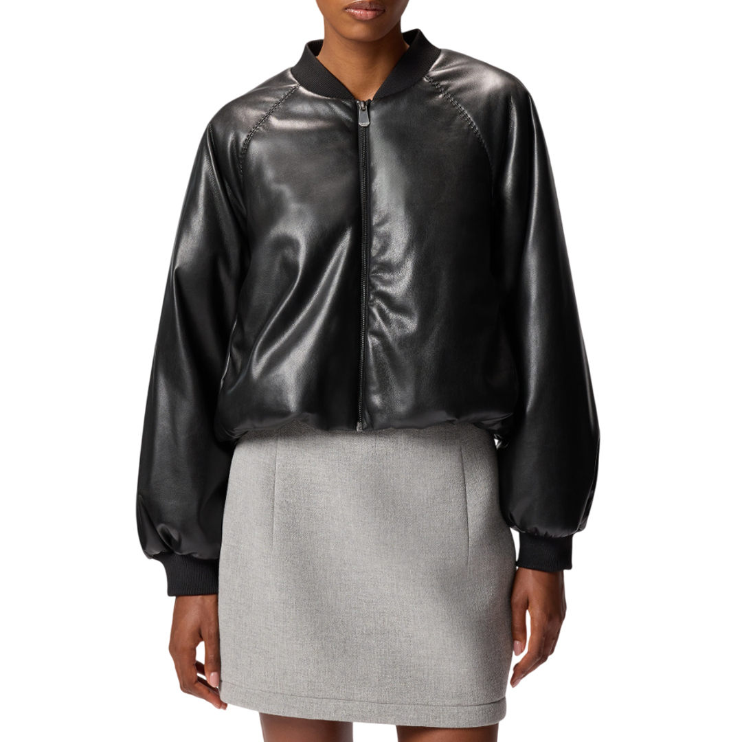 Giubbino corto con leggera imbottitura, realizzato in un tessuto spalmato dalla mano super soft che rende l'indosso particolarmente confortevole. Il modello presenta elementi tipici del bomber, come il classico colletto e i polsini in maglia a costine, ma rilegge la silhouette in chiave PINKO, proponendo un volume cropped e un fondo capo morbido e arricciato. Chiusura con zip davanti. Modello foderato.