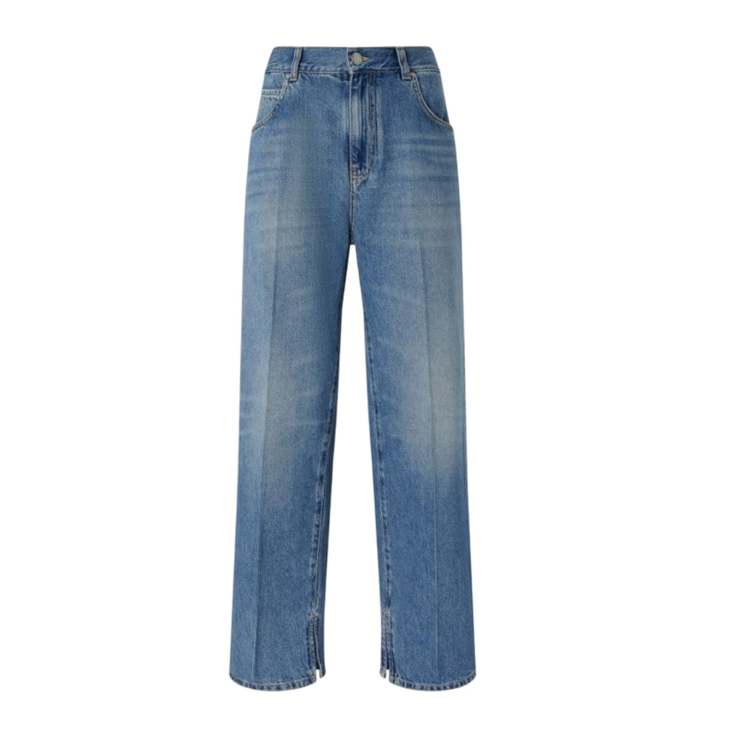 Jeans cinque tasche da donna in denim di cotone lavaggio wild ocean, dalla tonalità vintage media. I jeans sono caratterizzati da gamba dritta e leggermente ampia con piega centrale e piccolo spacco laterale a fondo capo, per un dettaglio di ispirazione sartoriale. La vita con cavallo rilassato si aggiunge alla vestibilità rilassata per creare un mood casual ma raffinato al tempo stesso, sia in ufficio che per i tuoi appuntamenti. Chiusura con zip e bottone a chiodo in metallo.