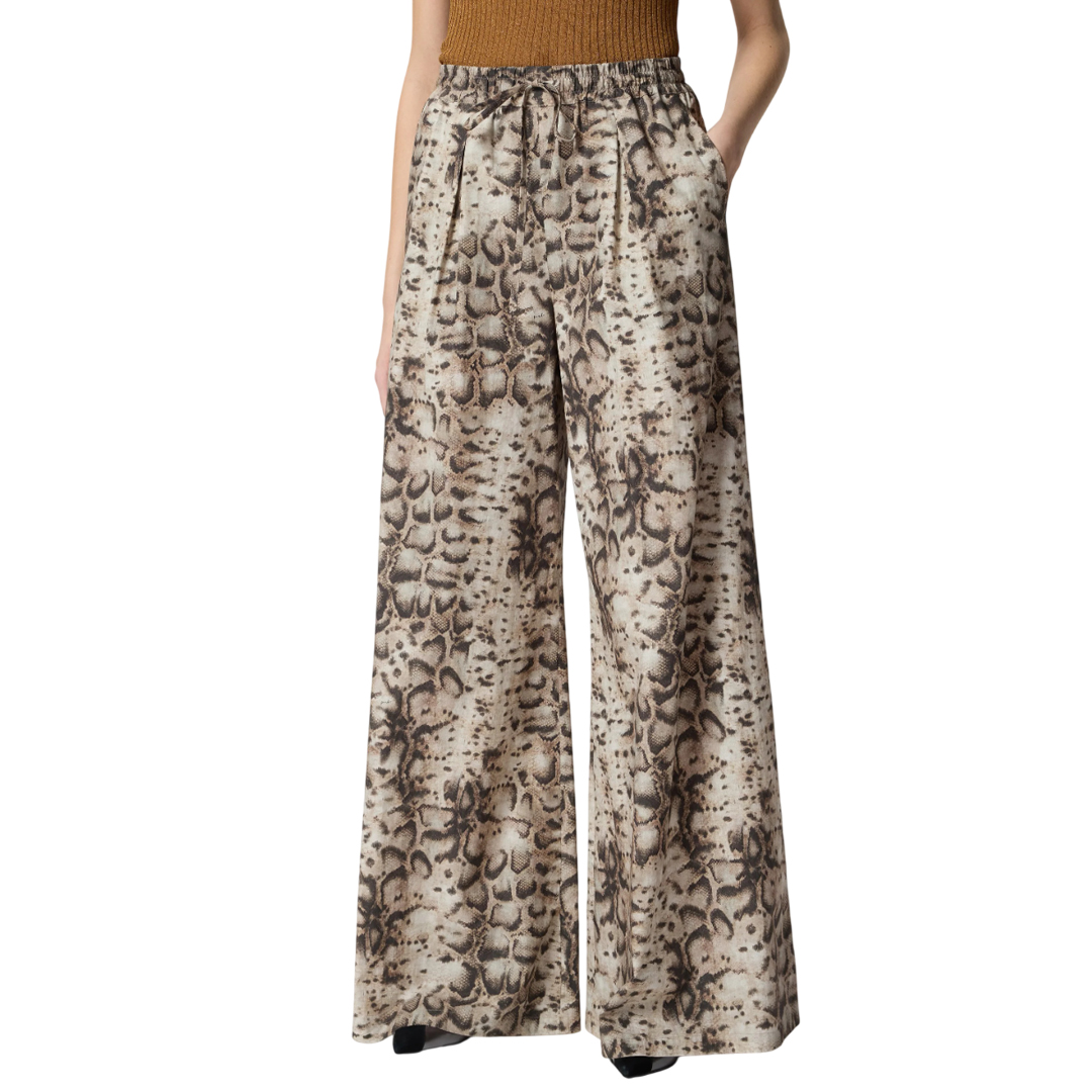 Pantaloni dal design ampio contraddistinti da un accattivante disegno snake all over e realizzati in mussola di puro cotone per donarti il massimo del comfort e della freschezza, in città come al mare. Il capo presenta una comoda vita elasticizzata con coulisse ed è dotato di pratiche tasche laterali. Grazie alla silhouette morbida e femminile e alla fantasia grintosa e contemporanea, espressione del DNA PINKO, questi pantaloni sono pronti a conquistare al primo colpo le fan dell'animalier e non solo.