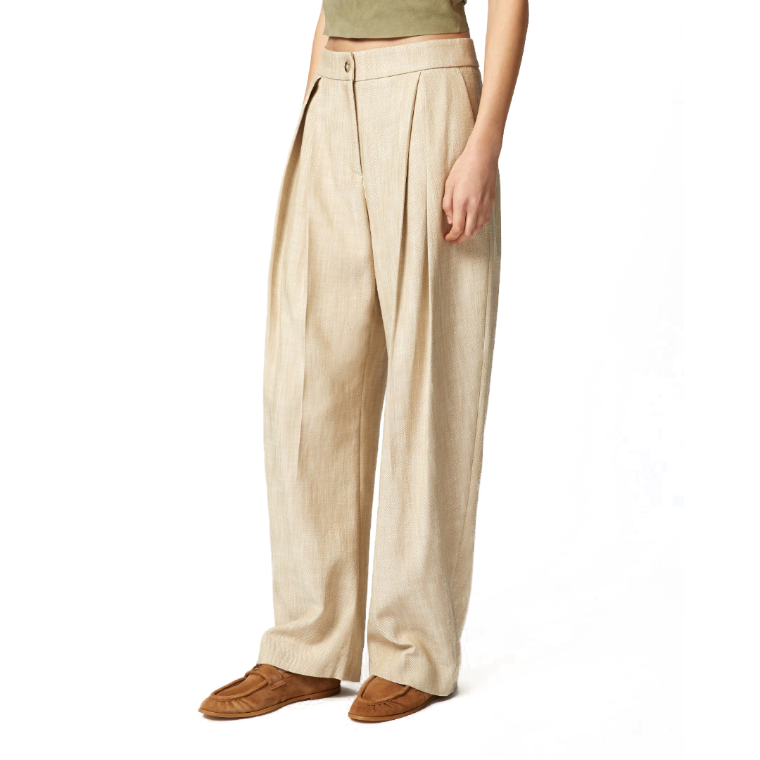 Pantaloni eleganti in tela di misto viscosa frisottina, un tessuto caratterizzato da un particolare filato ritorto che crea una superficie irregolare, quasi materica al tatto. I pantaloni lunghi sono caratterizzati da gamba ampia e leggermente arrotondata, con pinces di ispirazione sartoriale che costruiscono un volume elegante e raffinato. Le tasche alla francese sui fianchi aggiungono un dettaglio funzionale ai pantaloni in viscosa, chiusi con bottone in vita e zip nascosta. Abbina i pantaloni alla giacca nello stesso tessuto per un completo estivo da indossare tutti i giorni, anche quando fa più caldo.