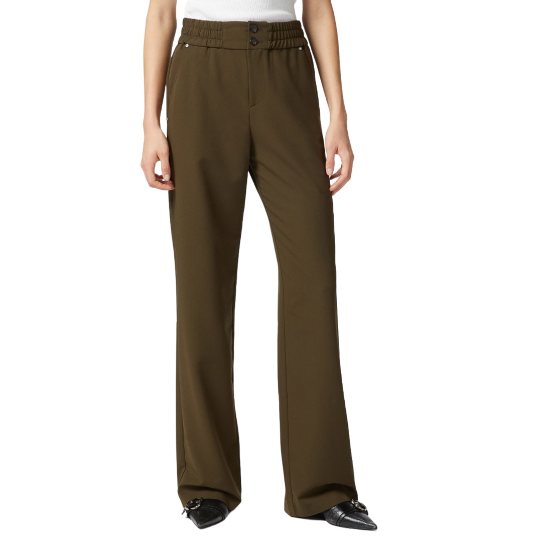 Pantaloni lunghi da donna realizzati in tessuto crêpe di viscosa stretch dalla mano particolarmente fluida. La vita alta è caratterizzata da elastico e motivo arricciato, completata da passanti per cintura. Gamba dalla linea dritta e leggermente ampia, con tasche alla francese sui fianchi. Chiusura con zip e doppio bottone in vita.