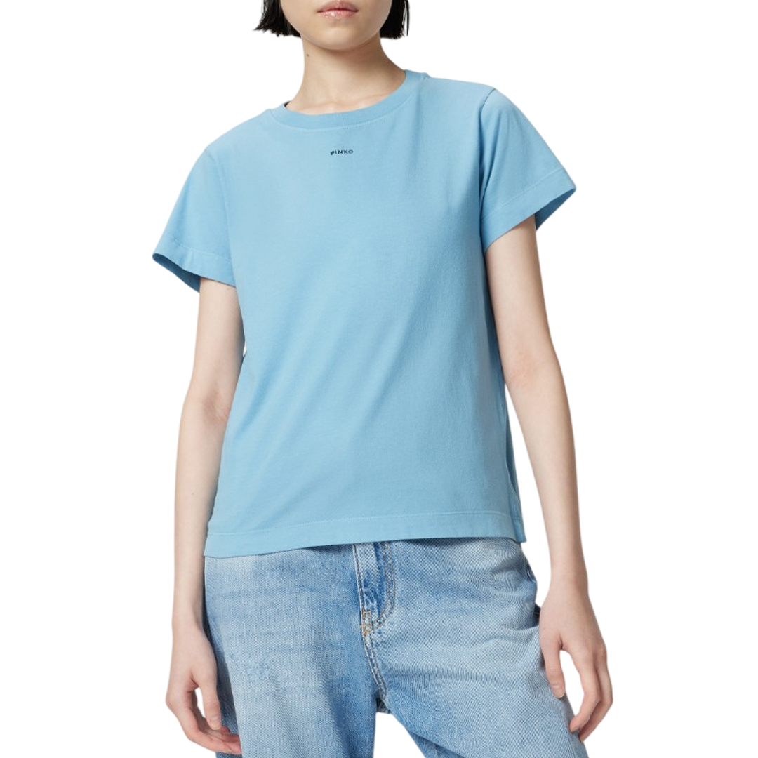 T-shirt a maniche corte in jersey di cotone trattamento old wash personalizzata con stampa mini logo PINKO centrale davanti.