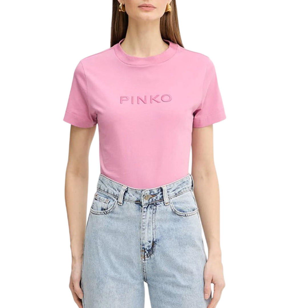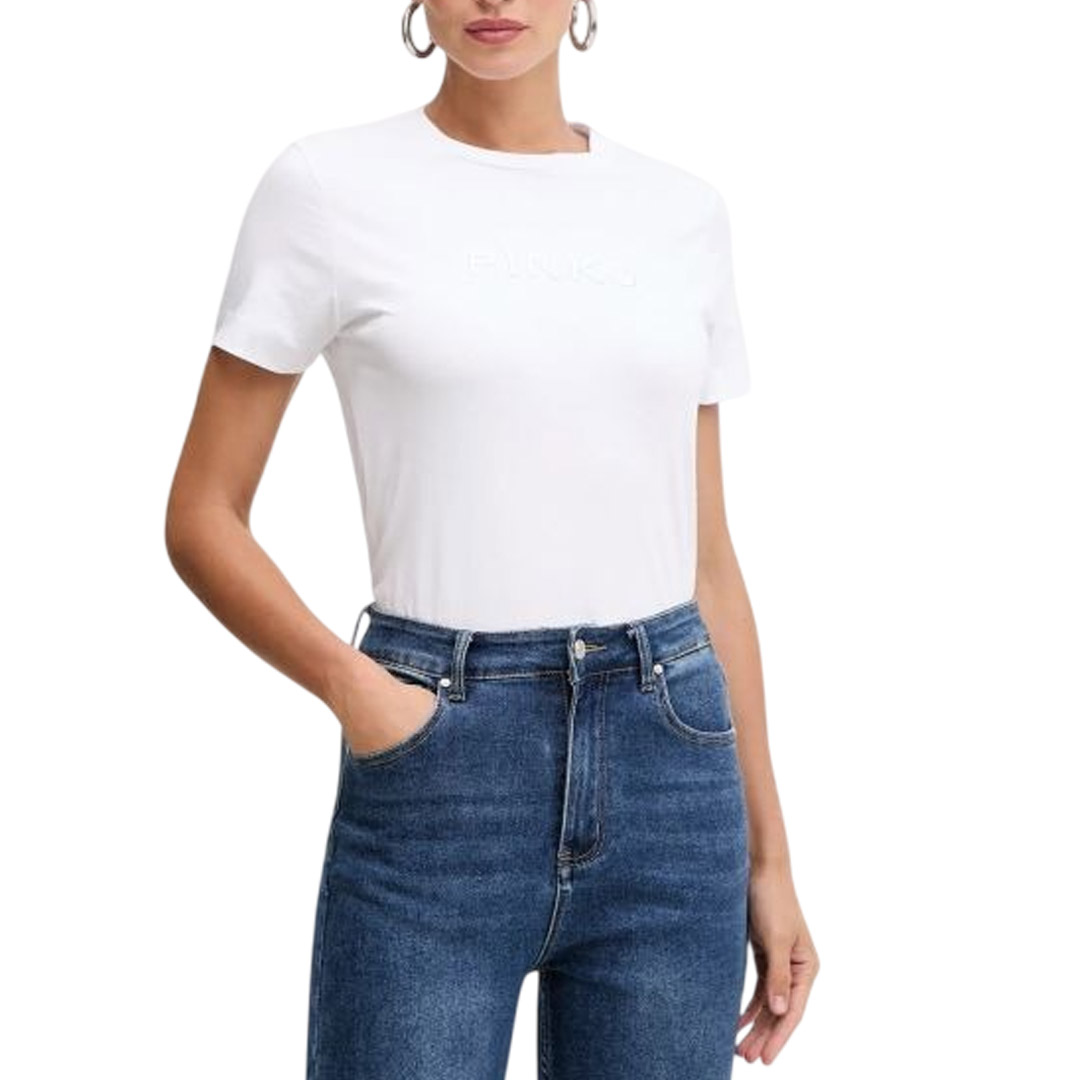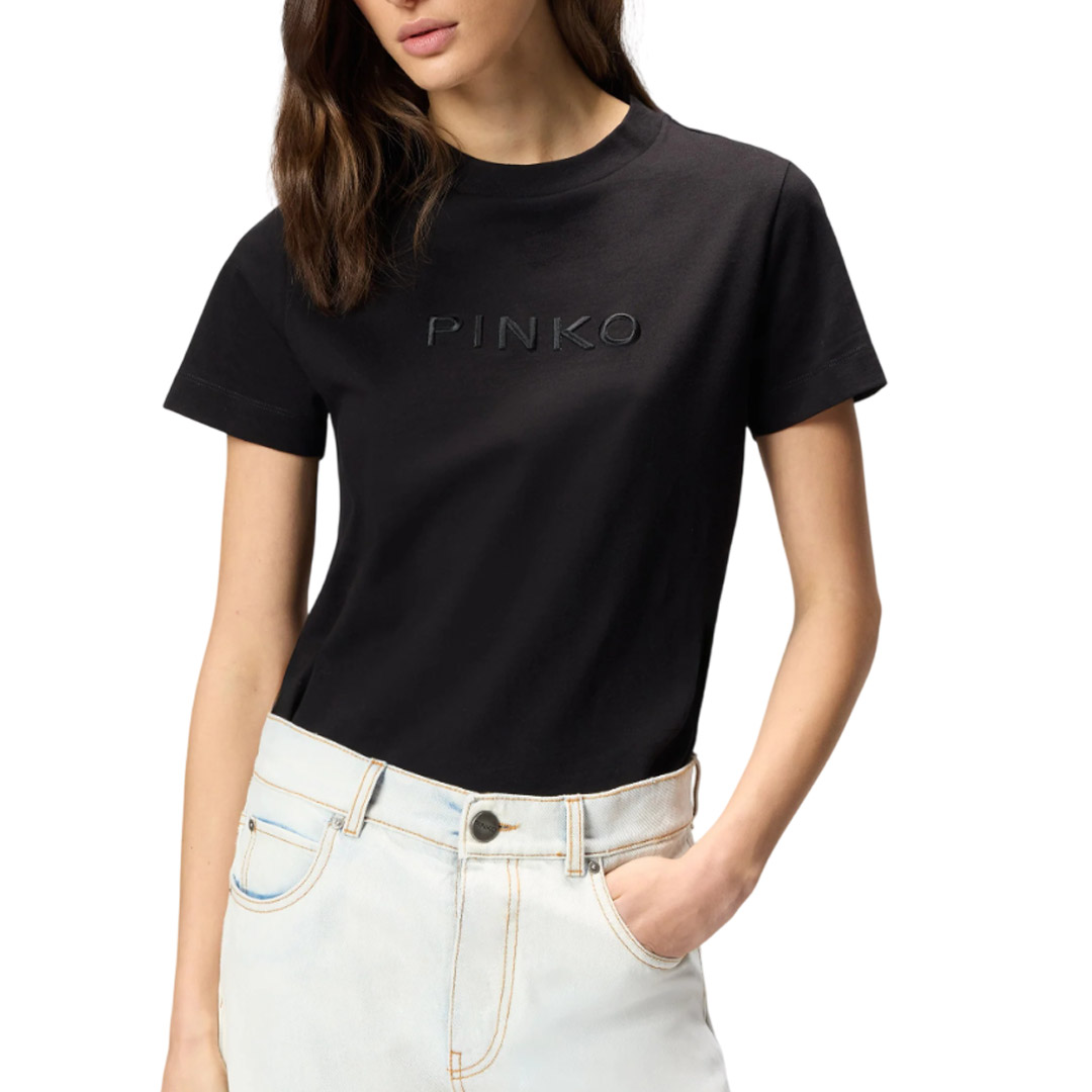 T-shirt a maniche corte realizzata in jersey di puro cotone con girocollo lavorato a costine sottili. Il modello è caratterizzato dall'iconico logo lettering PINKO sul petto sotto forma di ricamo in tono dal raffinato effetto lucido. Questa T-shirt si abbina con facilità ai tuoi pantaloni preferiti, elevando il tuo look in modo semplice, elegante e originale.
