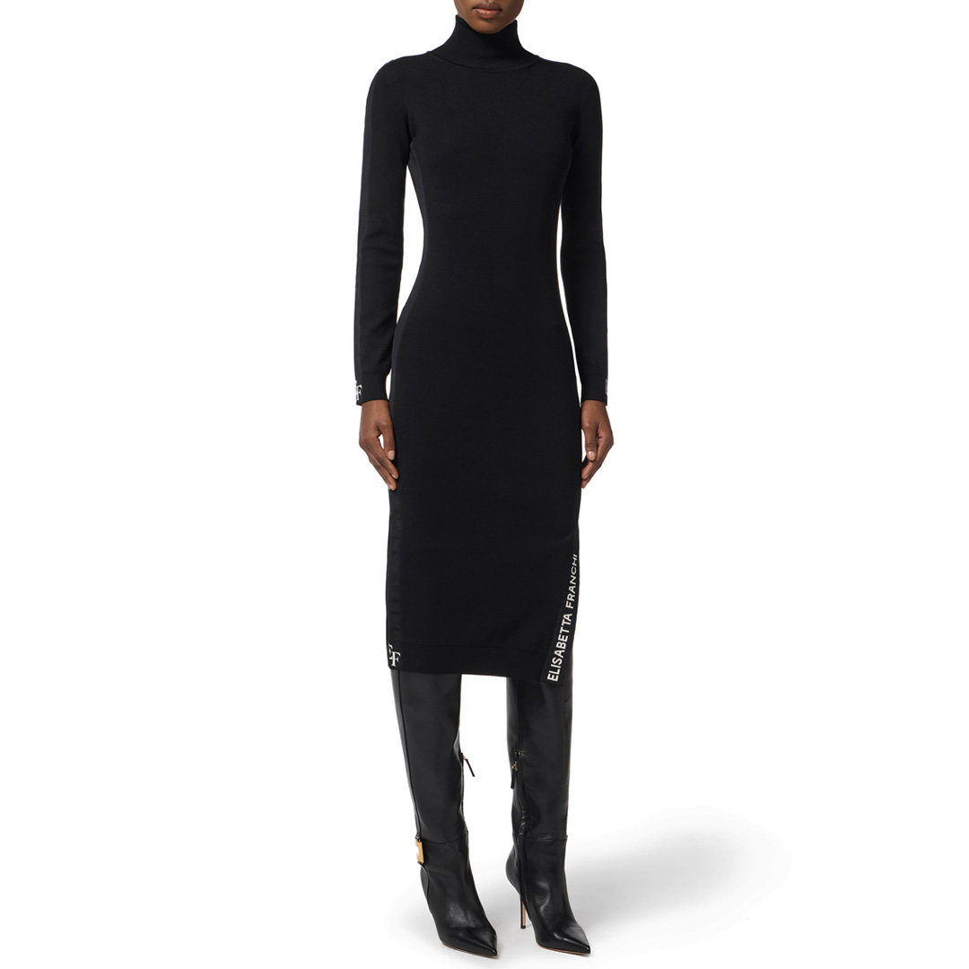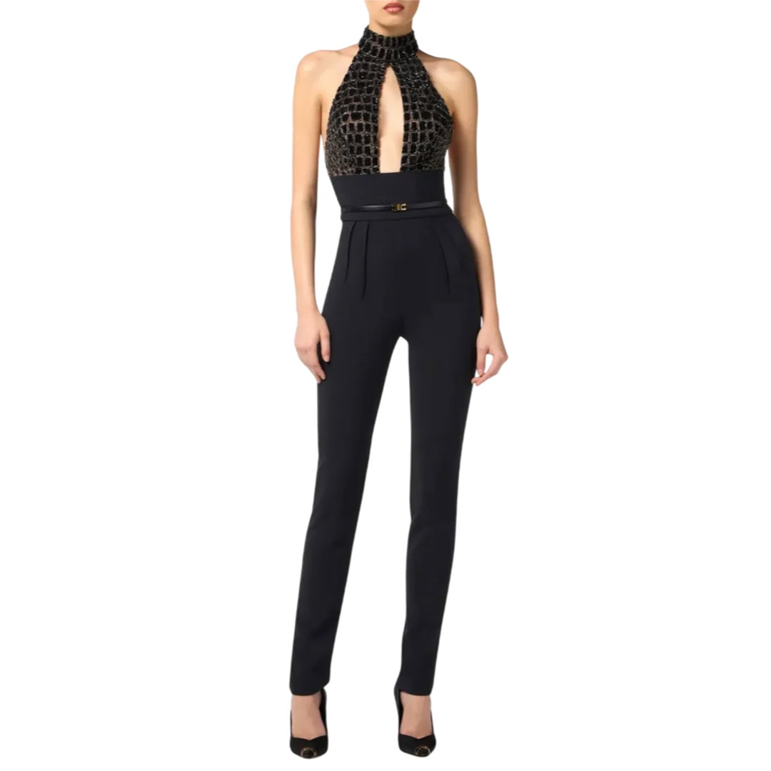 Tuta lunga in tessuto interlock crêpe di viscosa caratterizzata da profondo scollo sia davanti che sul retro, bustino e maniche dall'effetto drappeggiato, tenute insieme da catenina in metallo sul retro con piccolo moschettone. Pantaloni con taglio alto in vita, gamba dalla linea aderente e svasata al fondo.