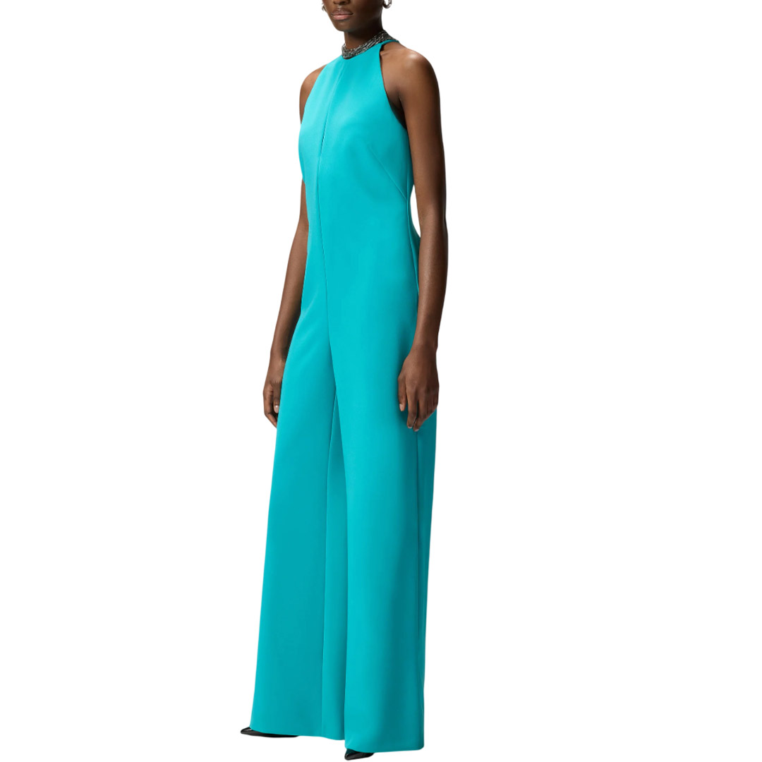 Tuta con pantaloni lunghi dalla linea dritta realizzata in un tessuto canvas tecnico dall'aspetto compatto e contemporaneo e foderata in leggera georgette per un indosso più confortevole. Il modello si distingue per la parte superiore smanicata con un raffinato scollo all'americana impreziosito da un sottile cut-out verticale sul davanti e da un dettaglio gioiello con strass, anch'esso sul davanti, che riproduce una collana girocollo a più fili. La tuta elegante è chiusa nel centro dietro con zip invisibile, per mantenere il più pulita possibile la linea di questo outfit perfetto sia per cerimonie sia per serate speciali che richiedono un dress code elevato. - DRAGON FRUIT TUTA
