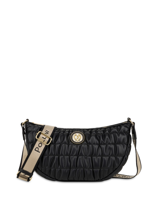 Borsa a tracolla realizzata in un nuovo materiale soft, dall'effetto goffrato, che dona rotondità e morbidezza. Medaglia smaltata in tono, con logo P-alloro in metallo effetto specchio. Tracolla con logo jacquard. Tracolla logata regolabile Chiusura con zip Interno foderato con tasca applicata e tasca con zip Colore: NERO/NERO Dimensioni: 17X35X9