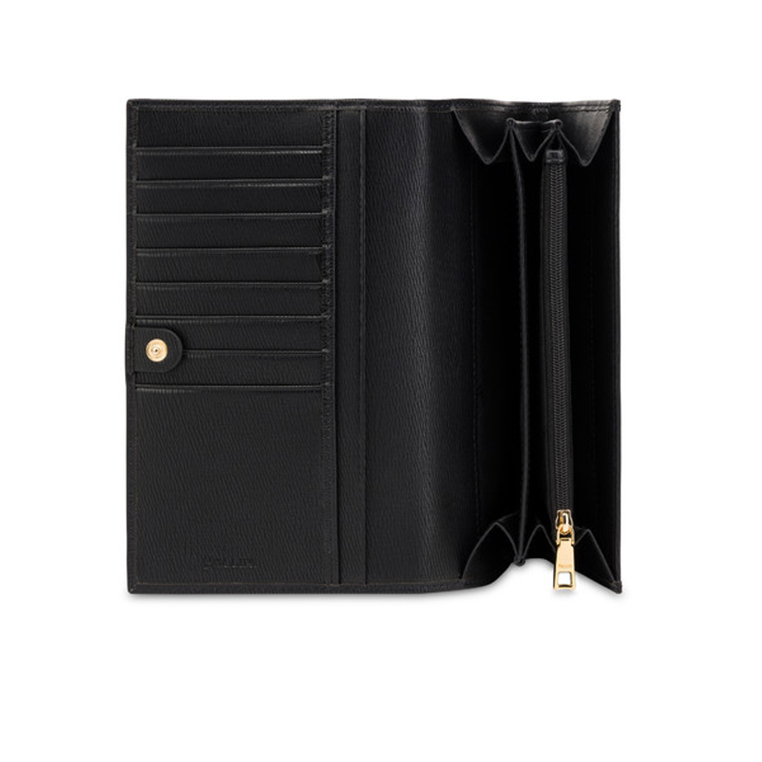 Portafoglio in un materiale dall'effetto palmellato. Macro bottone centrale con logo P-alloro in galvanica oro chiaro. Pratica organizzazione interna con vani per carte, banconote e documenti. Tasca portamonete interna con zip. Logo in metallo Chiusura con bottone a pressione 4 scomparti interni Scomparto centrale portamonete con zip 16 vani portacarte 3 scomparti per banconote 2 vani per banconote e documenti Dimensioni: 11X20X4