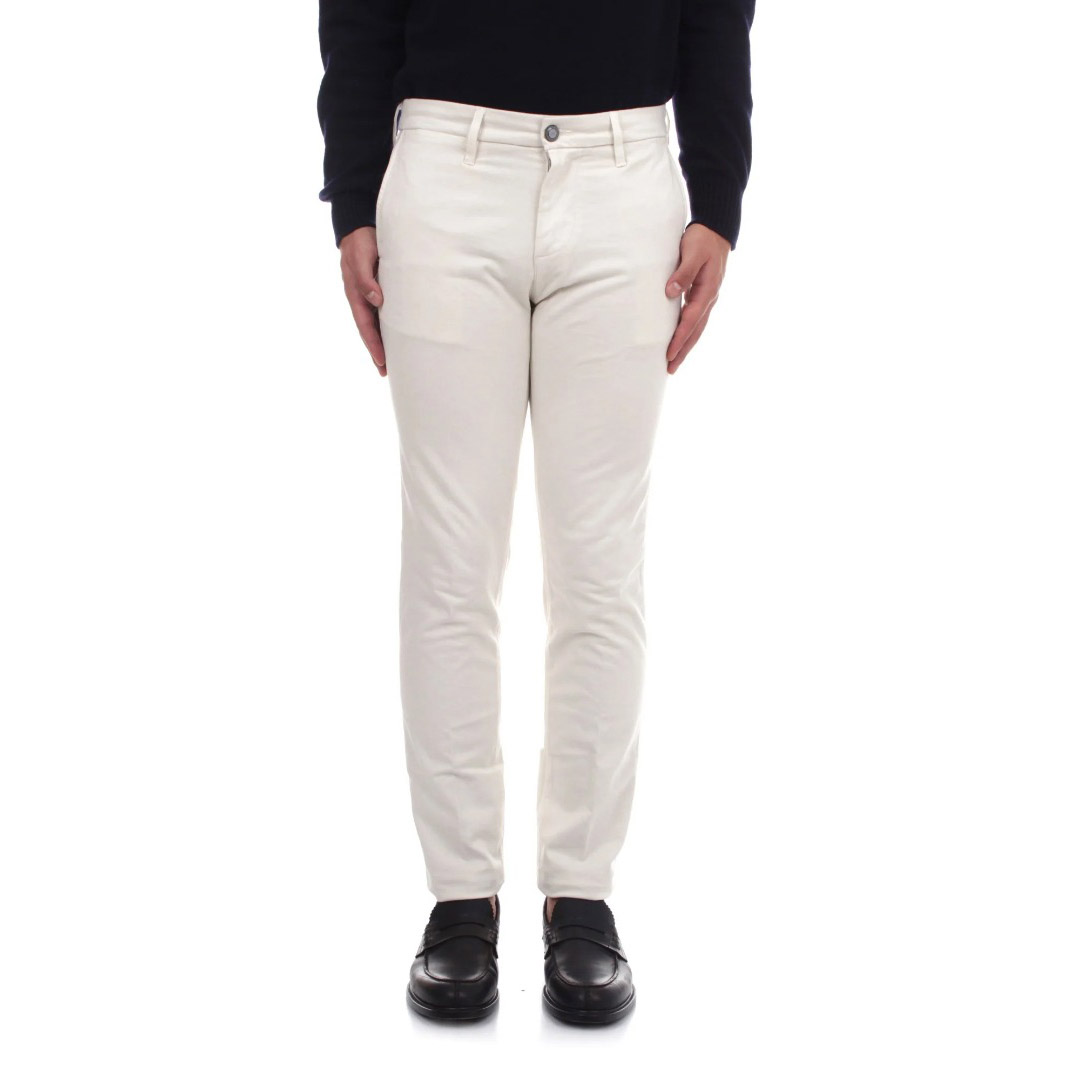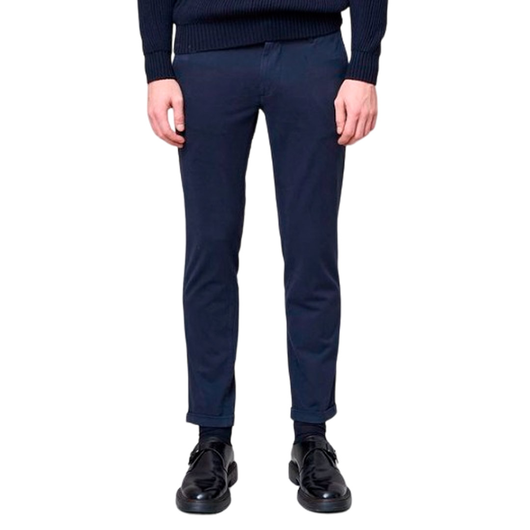 Pantalone chinos, tasca davanti francese. Dettaglio risvolto da 2,5 cm baso gamba e taschino porta orologio su lato davanti destro indossato. Vestibilità slim, vita medio alta.