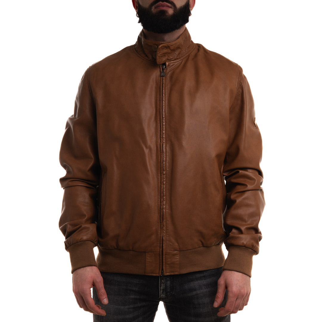 Giacca barracuda in pelle washed tinta unita. Colletto rialzato per una maggiore protezione e due bottoni in tono. Chiusura sul fronte con zip integrale. Maniche lunghe. Patch Roy Roger's in tono sulla manica. Tasche a filetto sul fronte. Fondo e polsini in maglia a costine in tono. Regular fit.