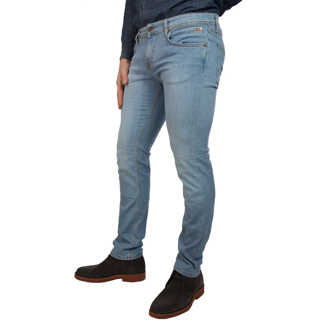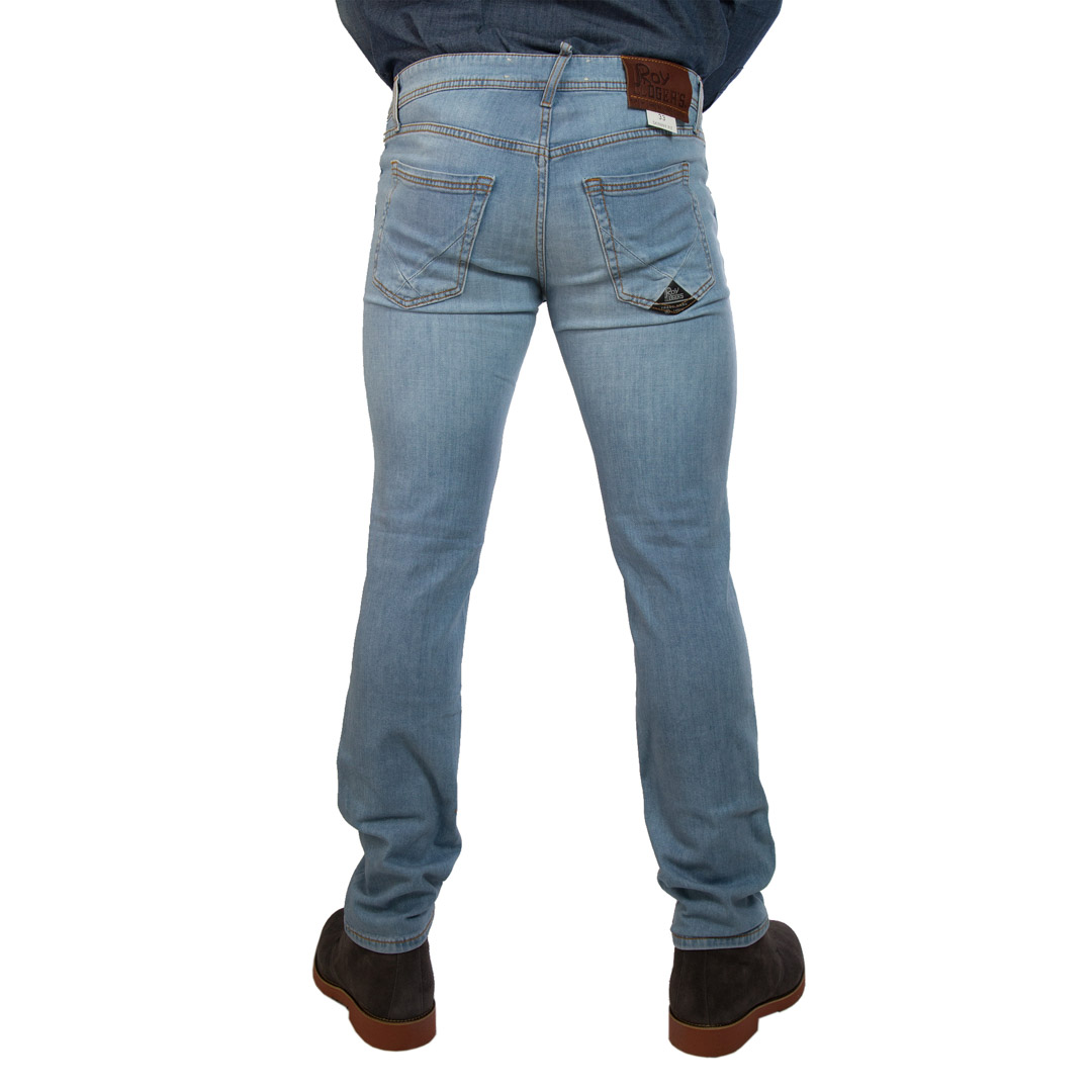 Jeans di manifattura italiana in denim elasticizzato con lavaggio chiaro. Chiusura sul fronte con bottone logato e zip. Due tasche sul fronte con rivetti in metallo e due tasche sul retro con label Roy Roger's applicato. Vita alta con passanti e salpa in pelle Roy Roger's applicata sul retro. Lavabile in lavatrice.