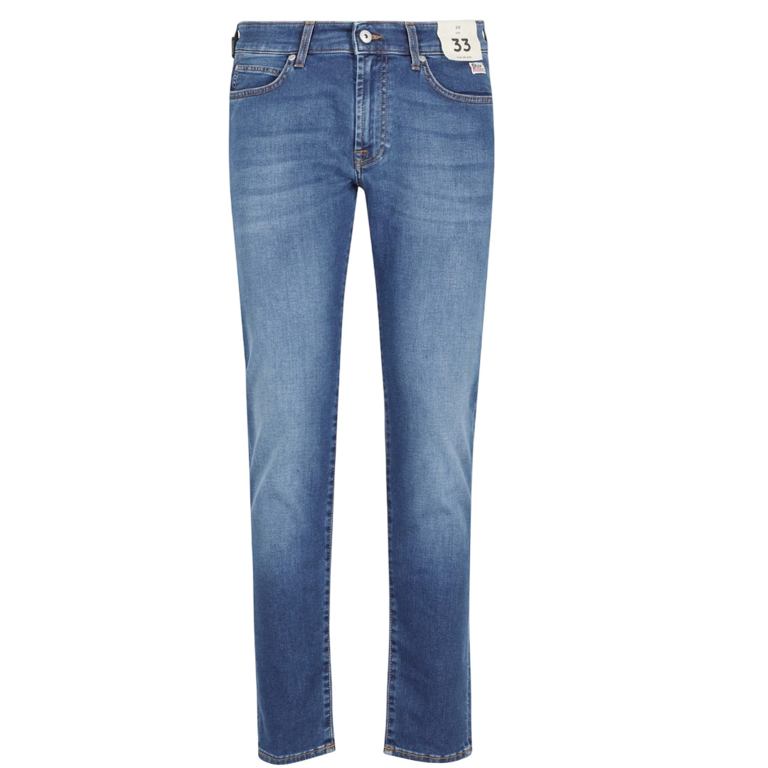Jeans in denim con lavaggio medio. Leggere baffature sul fronte. Vita media con passanti e salpa applicata sul retro. Chiusura con bottone logato e zip. Due tasche all'americana sul fronte e due tasche sul retro con label Roy Roger's applicata. Slim fit.
