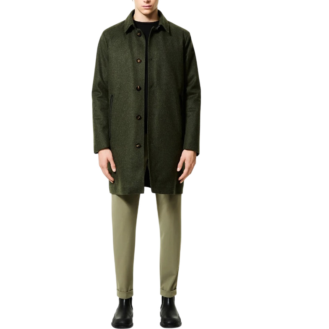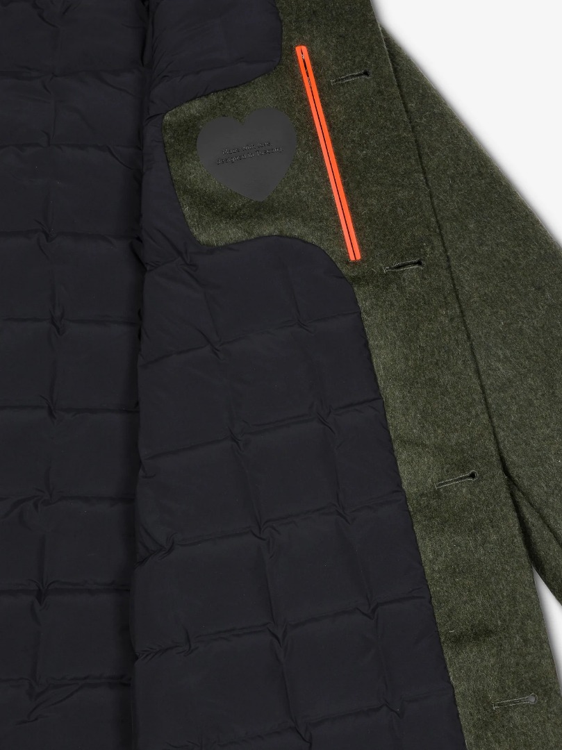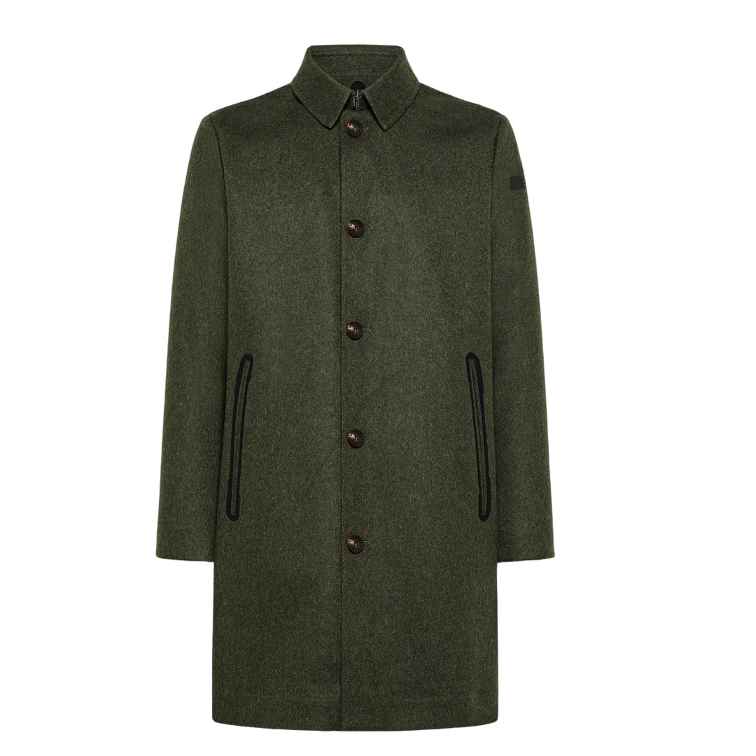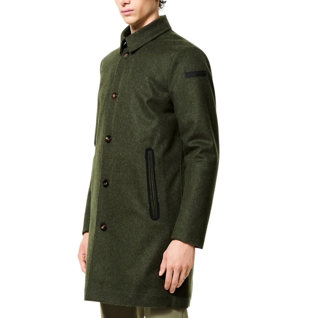Il soprabito loden dal fit regolare si distingue per il consistente tessuto a membrana traspirante, con esterno in pregiato panno di lana Moessmer verde foresta, e per la costruzione interamente termonastrata. Fra classicità e innovazione tecnologica, il capospalla è impreziosito da dettagli sartoriali come il colletto a camicia chiuso dal gancio metallico e la pregiata abbottonatura in corno, che gioca un moderno contrasto di finiture con la termonastratura nera che sottolinea le ampie tasche laterali. La soffice e calda imbottitura in piuma d'anatra 90/10 è contenuta nel tubico "square", che previene la fuoriuscita del materiale. L'innovativo sistema Floating Shield garantisce una portabilità impeccabilmente diritta e confortevole. Lo spacco centrale posteriore agevola la libertà di movimento. L'interno presenta un taschino chiuso dalla zip invisibile, ravvivato dal doppio filetto arancione fluo e dalla tag a cuore "Made with love, designed in Tuscany". Il logo a microiniezione nero sulla manica sinistra conferisce un'ulteriore nota di stile a un modello che attraversa i tempi e i trend con studiata eleganza