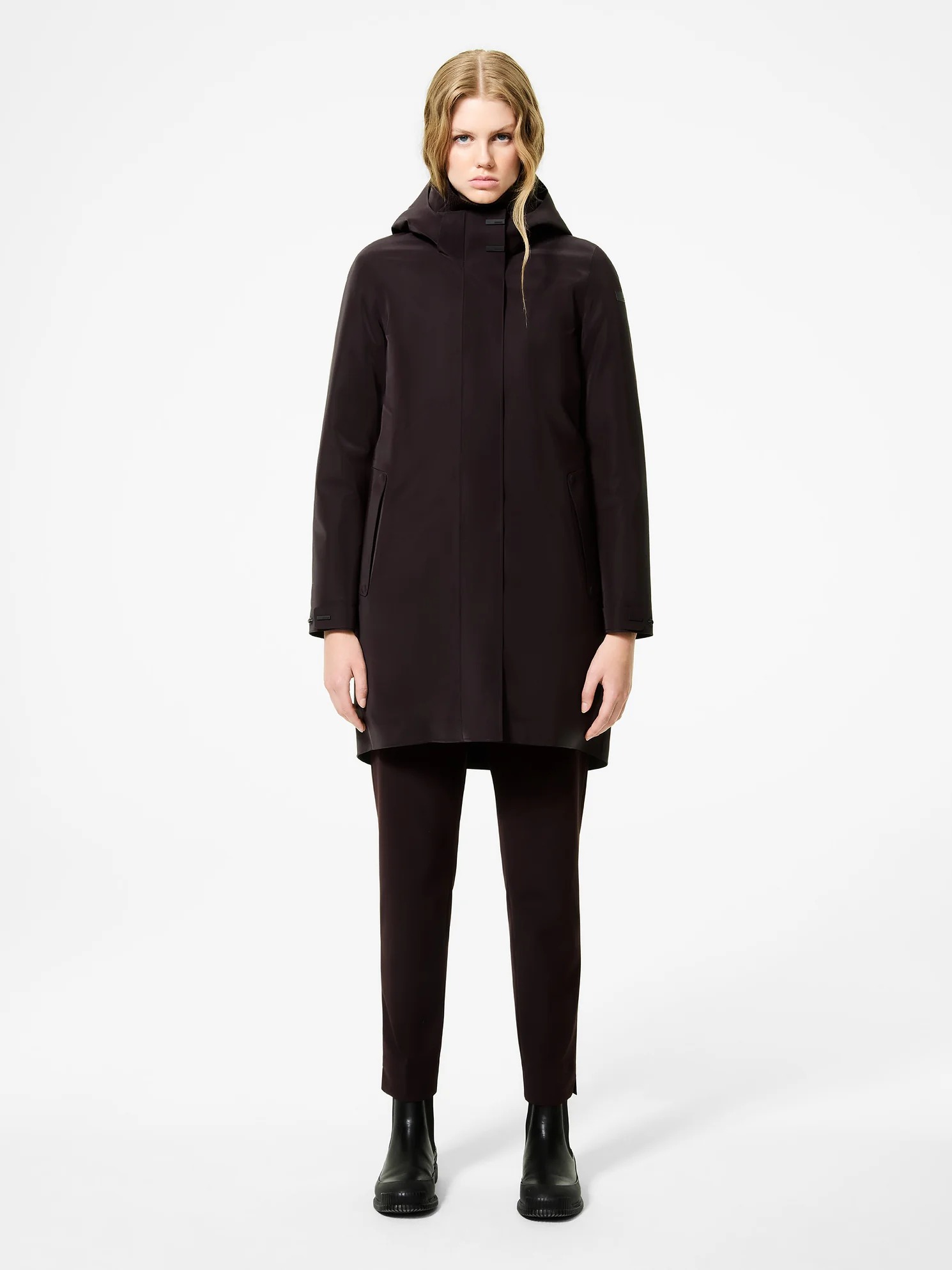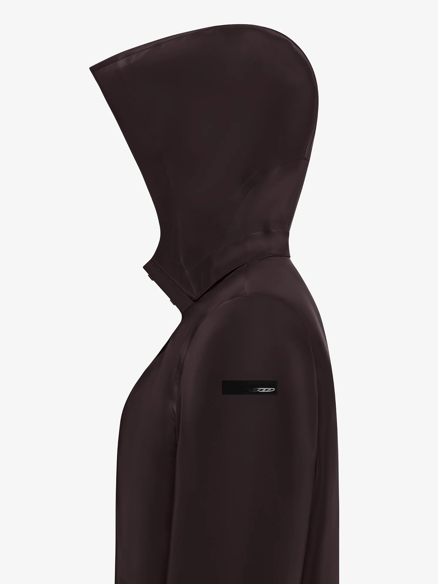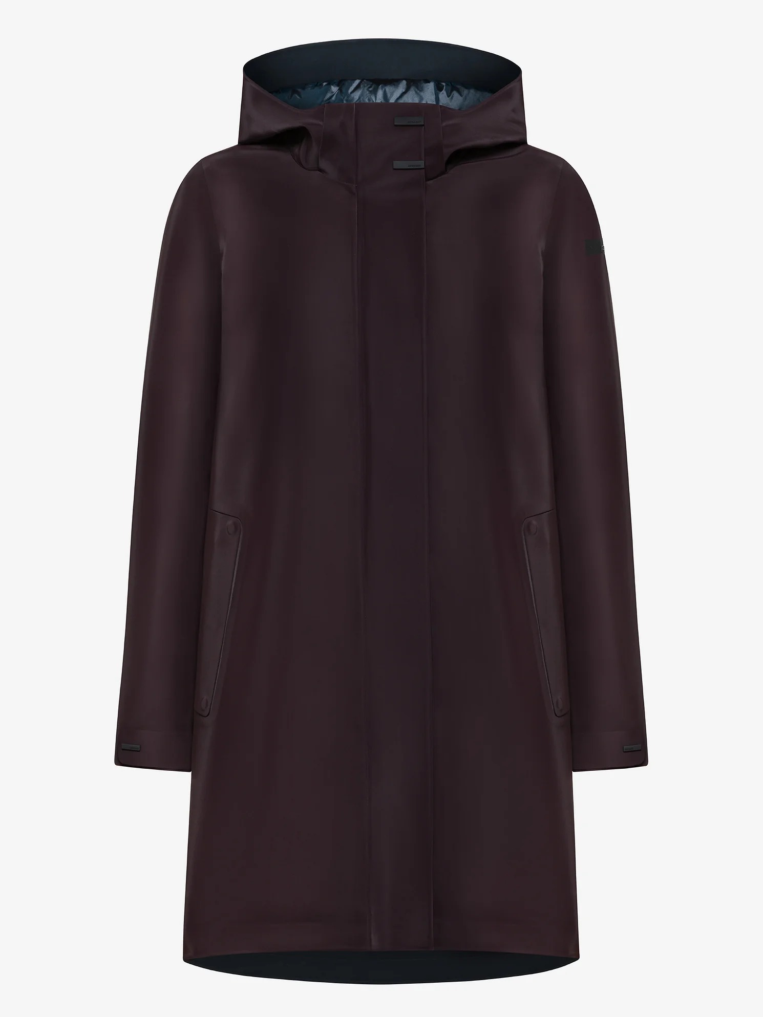 Il capospalla dalla lunghezza media è ideale per vivere con disinvolta eleganza la stagione fredda. Realizzata in tessuto spalmato a silicone, la giacca presenta un touch gradevolmente gommato e un look traslucido, che valorizza la sua linea morbida e dona affascinanti giochi di luce. La costruzione priva di impunture garantisce un perfetto isolamento dalla pioggia e dal vento, mentre l'interno presenta la calda imbottitura in soffice piuma d'anatra 90/10, contenuta nei canali tubici dell'innovativo sistema Floating Shield, per una vestibilità e un comfort inappuntabili. Il design minimalista è enfatizzato dalla pattina che nasconde la pratica zip con doppio cursore. Il cappuccio avvolgente, regolabile e imbottito, offre ulteriore protezione sottolineando il viso con grazia. Il logo a microiniezione nero sulla manica sinistra completa la creazione con una nota iconica.