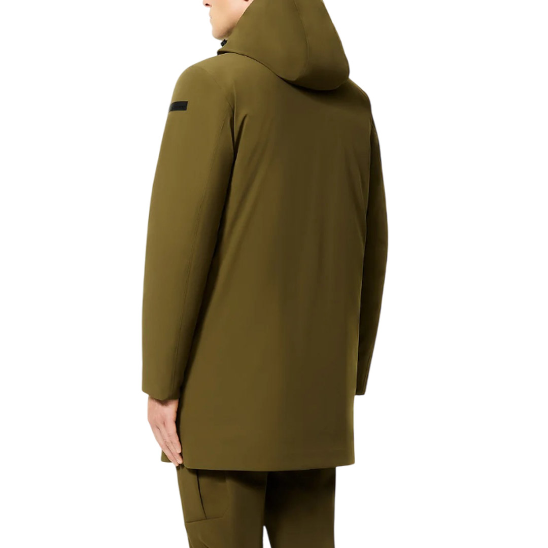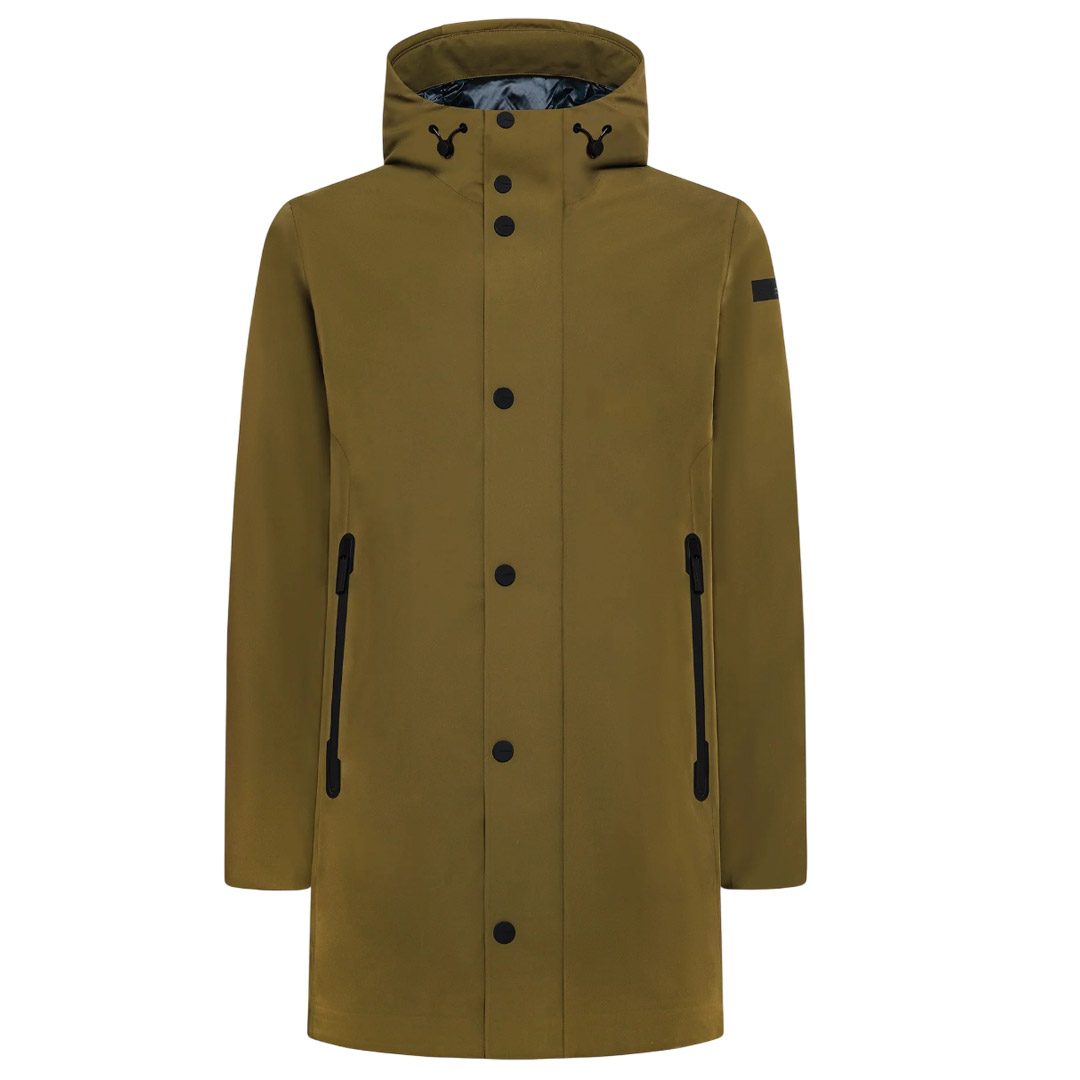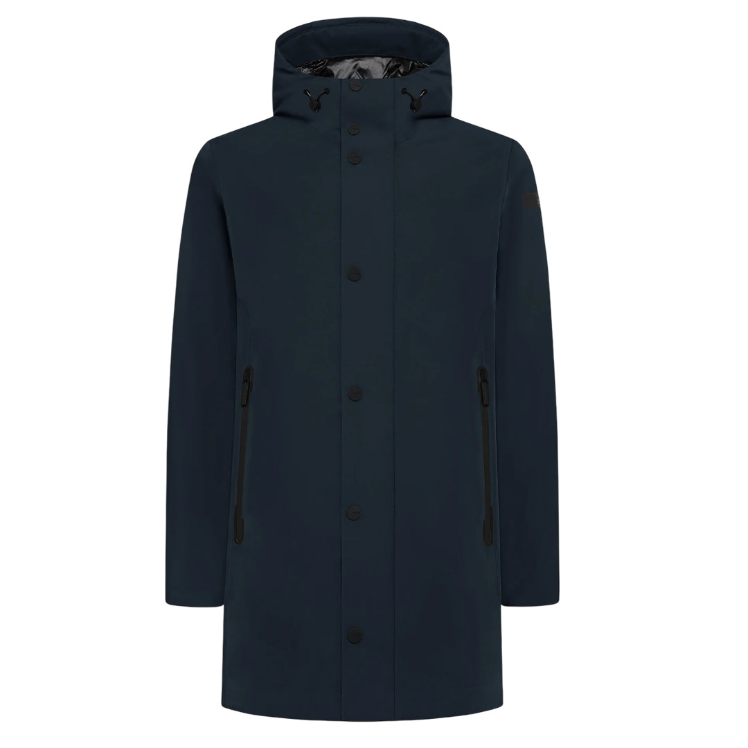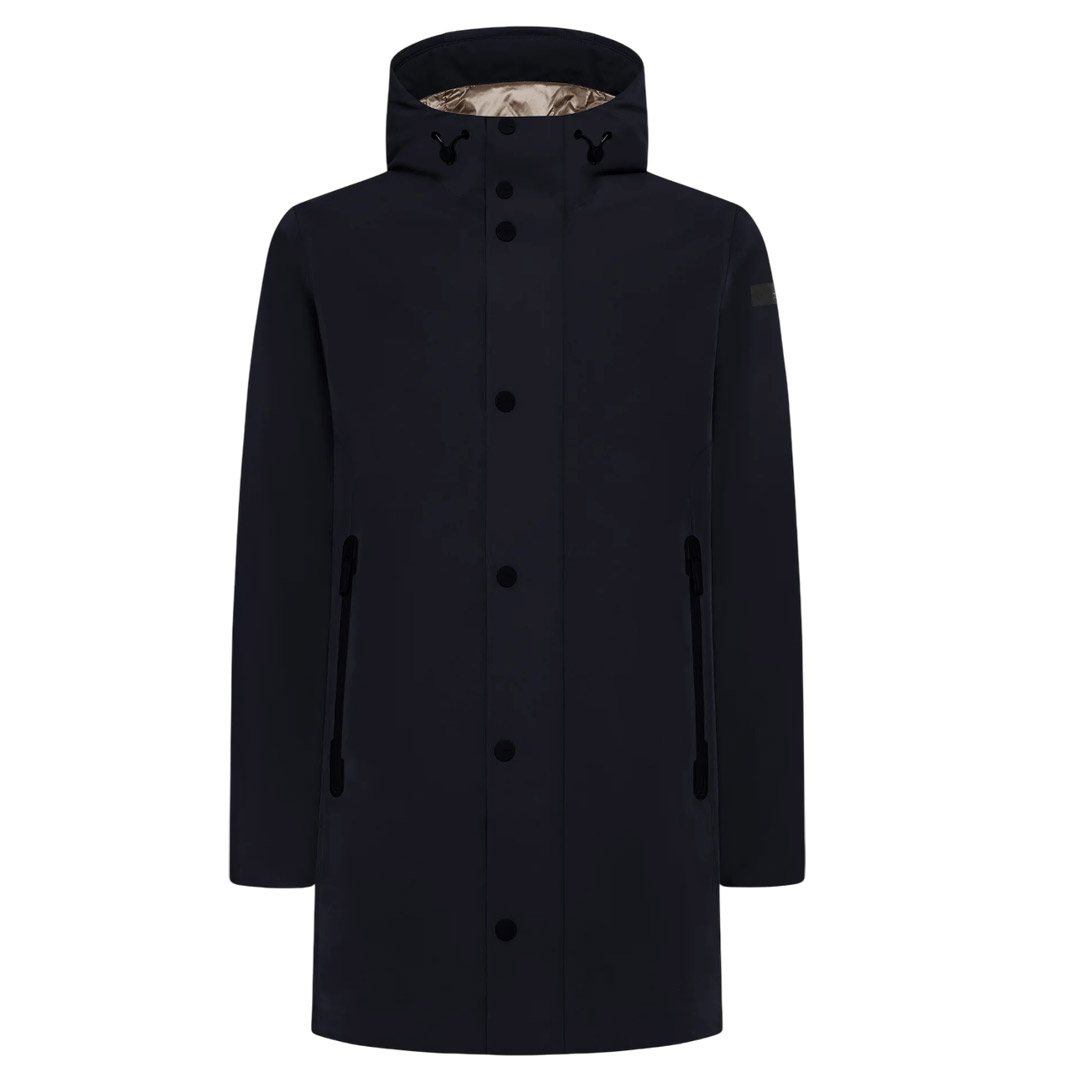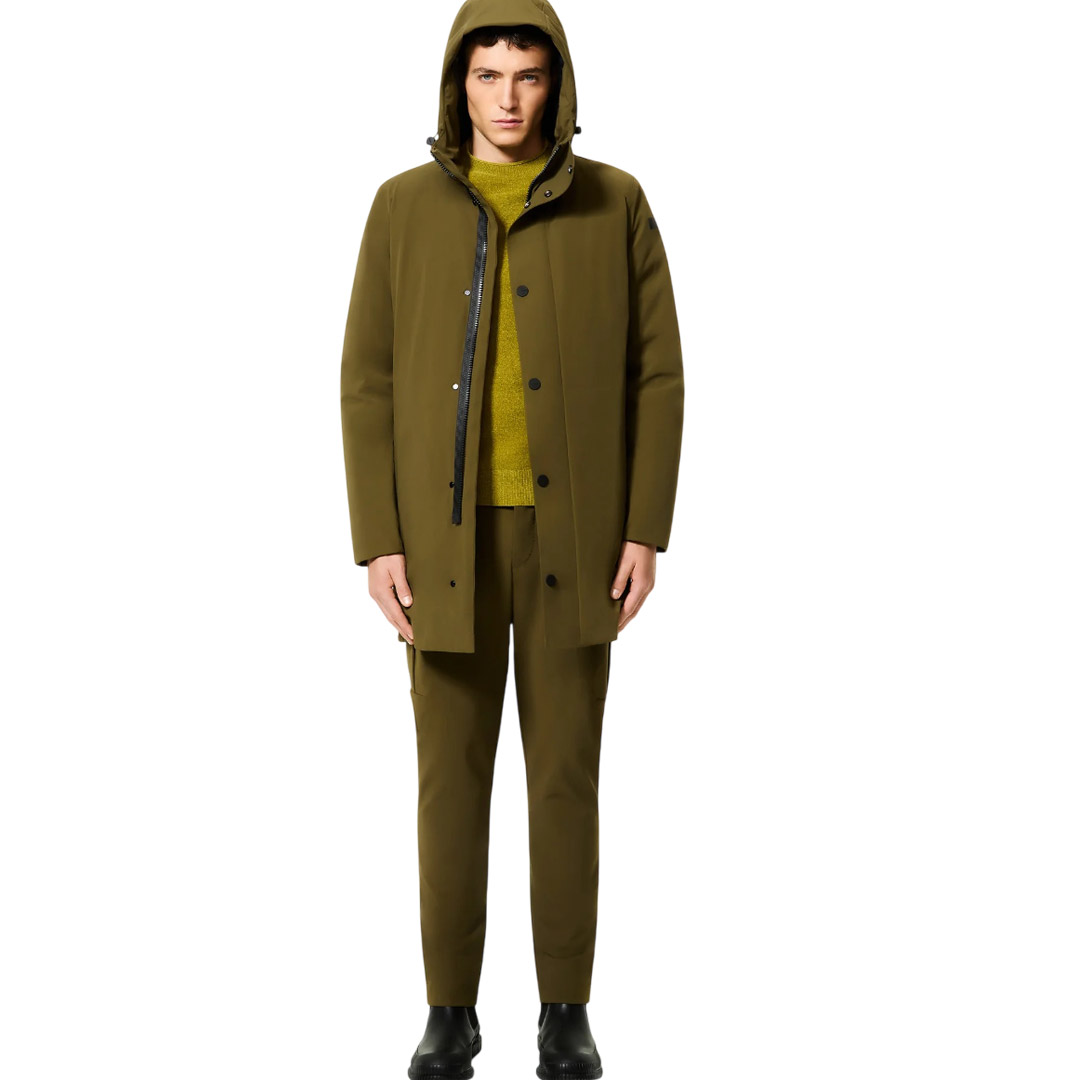 Il design minimalista, l'attenzione ai dettagli e alla scelta dei materiali distinguono l'eskimo in tessuto a membrana Stratofabric#3, traspirante e consistente. La costruzione interamente termonastrata garantisce l'impermeabilità e la protettività del capospalla, dotato di cappuccio fisso regolabile con coulisse elastica. A lasciare fuori il freddo pensa l'imbottitura in piuma d'anatra 90/10, soffice e leggera, racchiusa dai canali tubici a finitura glossy. L'esclusivo sistema Floating Shield consente un fit impeccabile e un comfort impareggiabile alla vestibilità dritta e regolare. Lo stile estremamente nitido è enfatizzato dal look opaco del tessuto esterno Montecristo. Vivacizzano il davanti le ampie tasche laterali termonastrate e i bottoni a pressione gommati neri. Questi ultimi chiudono la patta che nasconde la zip integrale con doppio cursore. L'interno è dotato di un taschino con zip invisibile, impreziosito dal doppio filetto arancione e dall'iconica tag a cuore "Made with love, designed in Tuscany". Il logo a microiniezione nero sulla manica sinistra è il tocco esclusivo che completa la giacca trequarti essenziale e ricercata.