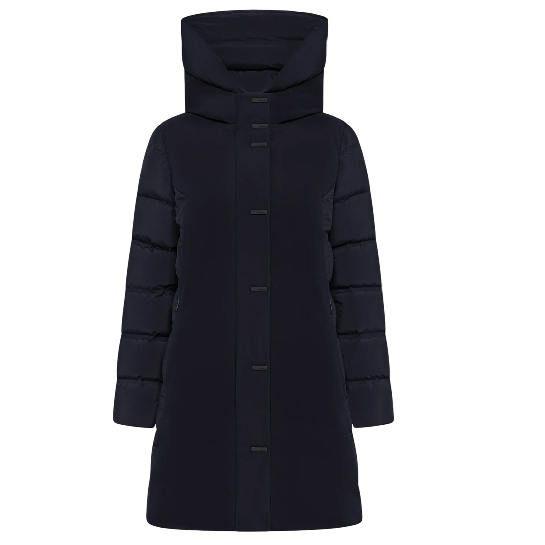 Il capospalla dal fit regolare con lunghezza al ginocchio si distingue per lo stile pragmatico e al contempo elegante. Il tessuto a membrana traspirante e impermeabile sa unire alla leggerezza dei materiali hi-tech l'assoluta protezione dalle intemperie e dal freddo più pungente. Il davanti si caratterizza per il look super opaco dell'esterno in SURFLEX®, particolarmente liscio al tatto, che gioca a contrasto con la texture del retro, le maniche, i fianchi e il cappuccio imbottiti dai canali tubici privi di impunture, che contengono la calda imbottitura in piuma d'anatra. Il sofisticato dettaglio della pattina con bottoni a barretta satinata nasconde la chiusura a zip termonastrata con il pratico doppio cursore. Le tasche laterali con zip invisibili e il logo a microiniezione nero sulla manica sinistra completano lo stile distintivo del capo. Il parka, dall'anima versatile, può essere indossato con pantaloni dal taglio carrot per donare uno stile unico e distintivo all'outfit invernale di tutti i giorni.