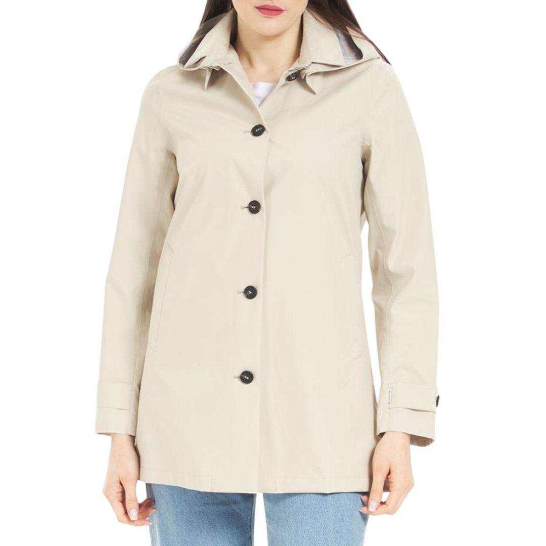 L'impermeabile donna modello April fonde comfort e protezione nel segno dello stile animal free. Leggero e versatile, presenta cappuccio rimovibile e regolabile, cuciture nastrate, cinturini con doppio bottone ai polsi e tasche laterali in stile trench. I bottoni gommati neri con logo inciso e il badge rotondo sul cappuccio fanno da firma distintiva.
