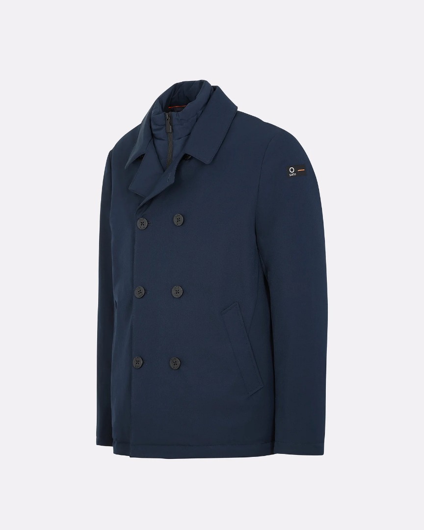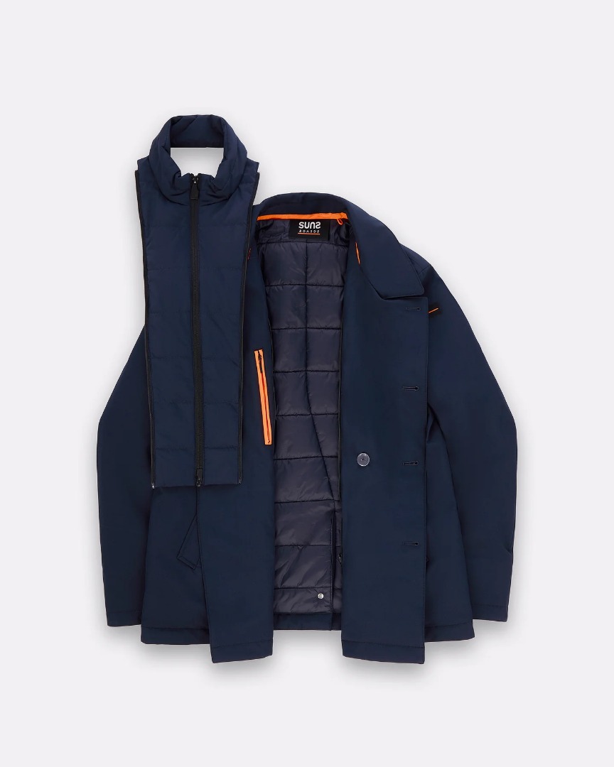 Un giubbotto uomo doppiopetto dal taglio classico reinterpretato in chiave tecnica. Il modello Coat Tech si distingue per il suo tessuto 4-way stretch con membrana TPU che garantisce protezione e flessibilità, mantenendo un’estetica pulita ed essenziale. L’imbottitura leggera in polyfil assicura il giusto comfort termico durante la stagione fredda. All’interno, la fodera trapuntata in nylon ton sur ton e il collo interno con zip aggiungono uno strato funzionale e protettivo. Doppiopetto con chiusura a bottoni: stile classico con linea moderna. Tessuto tecnico stretch con membrana TPU: flessibilità e protezione contro vento e freddo. Imbottitura leggera in polyfil: calore senza ingombro (120 gsm corpo / 100 gsm maniche). Fodera interna trapuntata: in nylon 380T tono su tono per comfort e isolamento termico. Polsini interni in lycra nera: per una vestibilità confortevole e antivento. Collo interno con zip: dettaglio pratico per maggiore protezione. Welt pocket senza zip: design pulito e funzionale. Finitura arancione: dettaglio distintivo Suns.