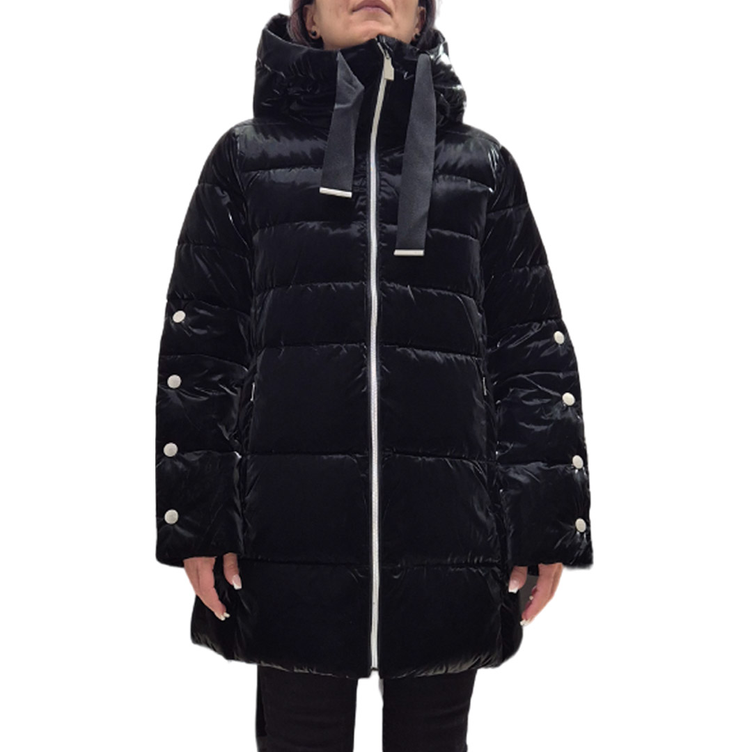 Giubbotto realizzato in nylon con spalmature effetto velluto, con logo SUNS sulla manica sinistra. Il capo presenta dettagli manica con bottoni in metallo e un comodo cappuccio in coulisse con finalini in metallo che donano lucentezza. Una creazione ideale per un'immagine chic ed elegante ma sempre adatta ad ogni occasione.