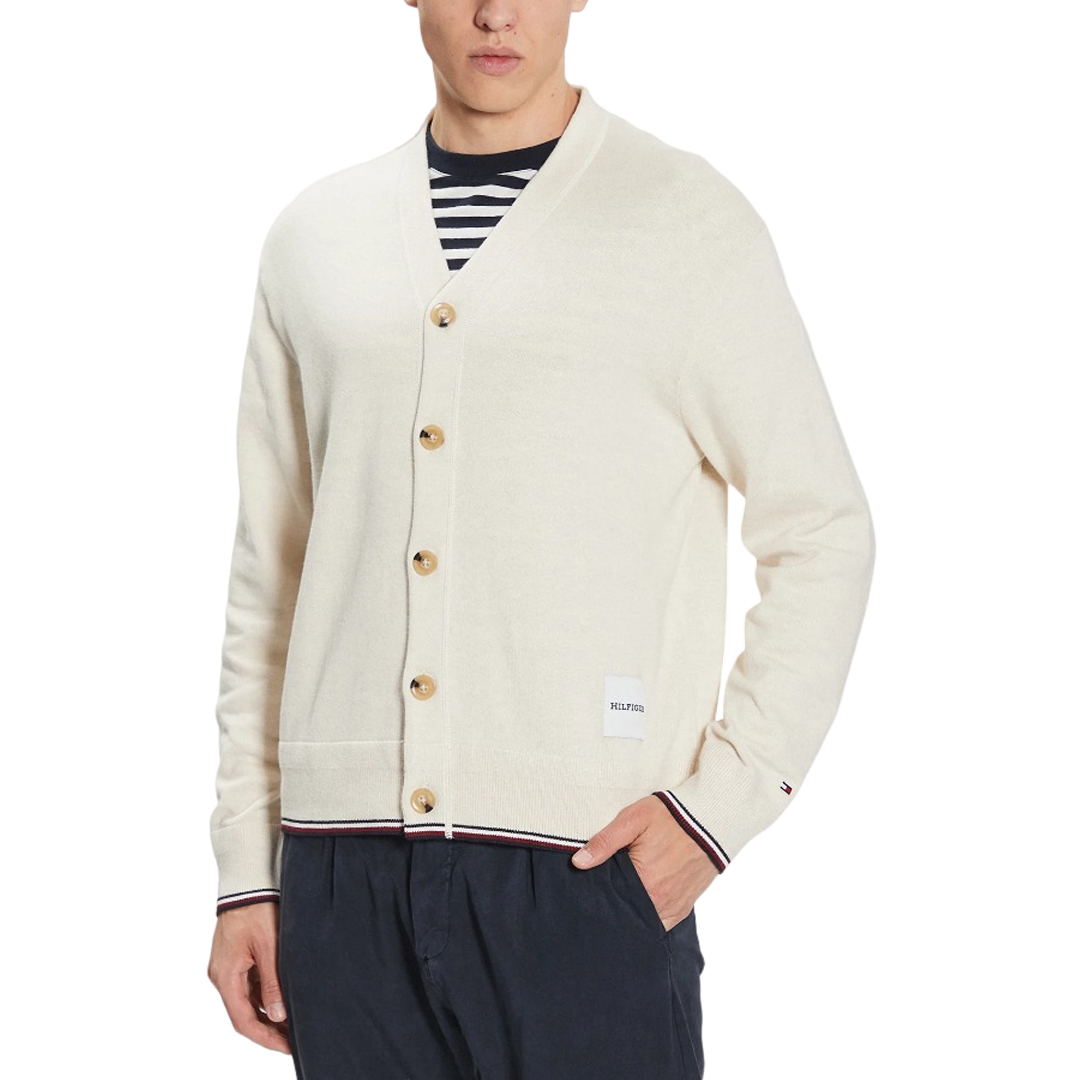 Il cardigan dalla vestibilità morbida è decorato dal dettaglio a righe global sul fondo e sui polsini, che dona un'irresistibile nota di colore. • Misto cotone • Fondo e polsini a coste con dettaglio a righe global • Scollatura a V • Patch logo Hilfiger monotipo sul davanti • Branding Tommy Hilfiger • Bandierina Tommy Hilfiger ricamata sul polsino • Relaxed fit • Spalle scese