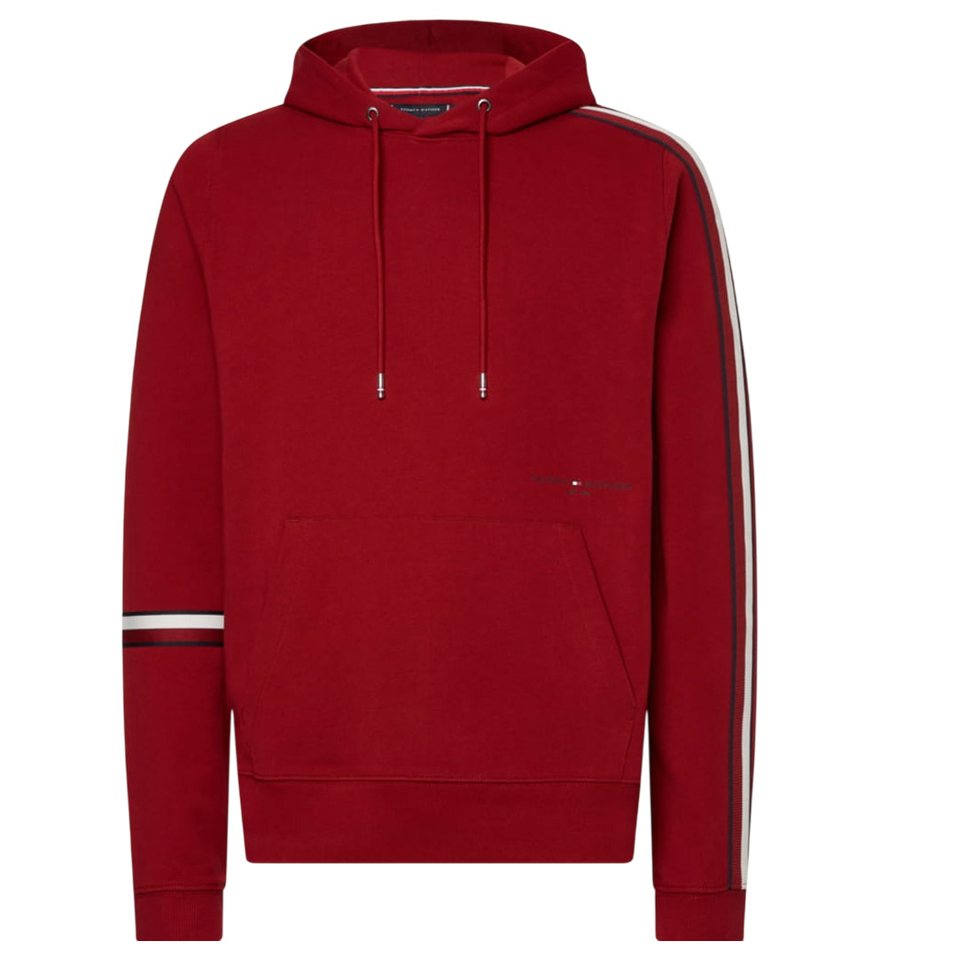 Felpa Tommy Hilfiger Global Stripe Hoody da uomo garzata in cotone, con cappuccio regolabile da cordino, piccolo logo in stampa gommata asimmetrico al di sopra del tascone a marsupio, nastro iconico in maglia a coste nei colori istituzionali su spalla e maniche lunghe, polsini e cannolè in maglia