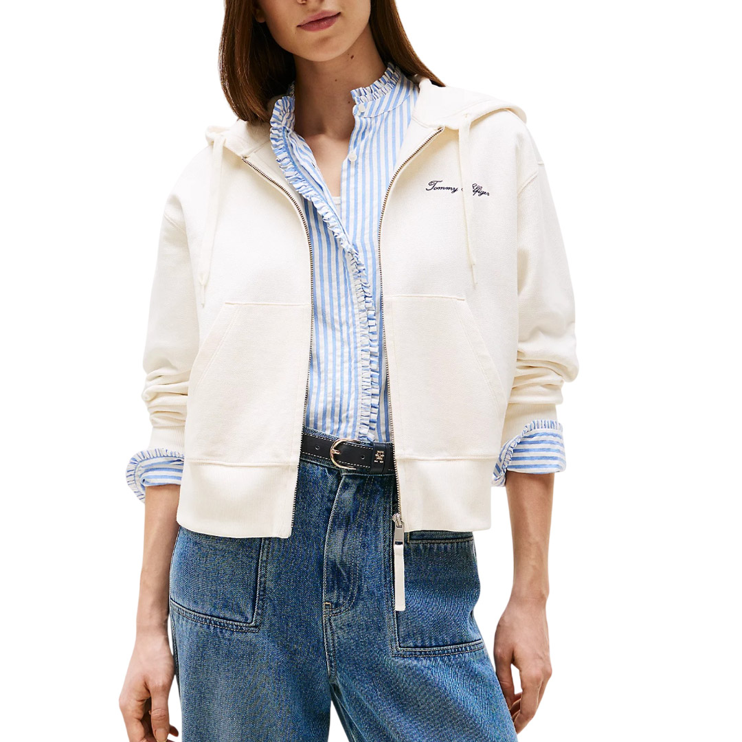 La felpa con cappuccio e zip integrale si distingue per il logo in corsivo ricamato sul petto, per un tocco esclusivo ai tuoi look a strati. Caratteristiche principali • Piqué di misto cotone • Collo con cappuccio e lacci • Zip integrale • Tasca a marsupio divisa • Fondo e polsini a coste • Logo Tommy Hilfiger in corsivo ricamato sul petto • Branding Tommy Hilfiger • Bandierina Tommy Hilfiger ricamata sulla manica