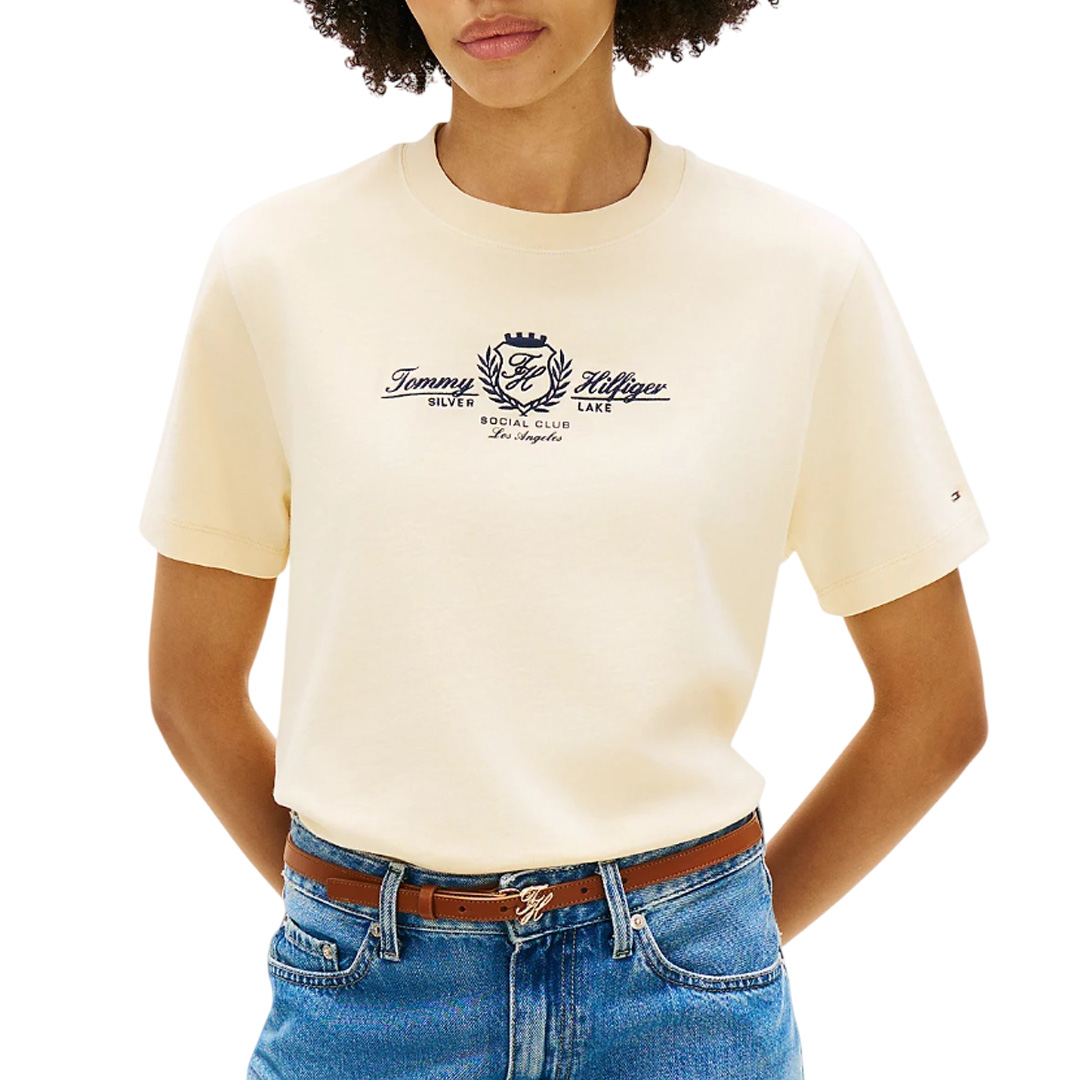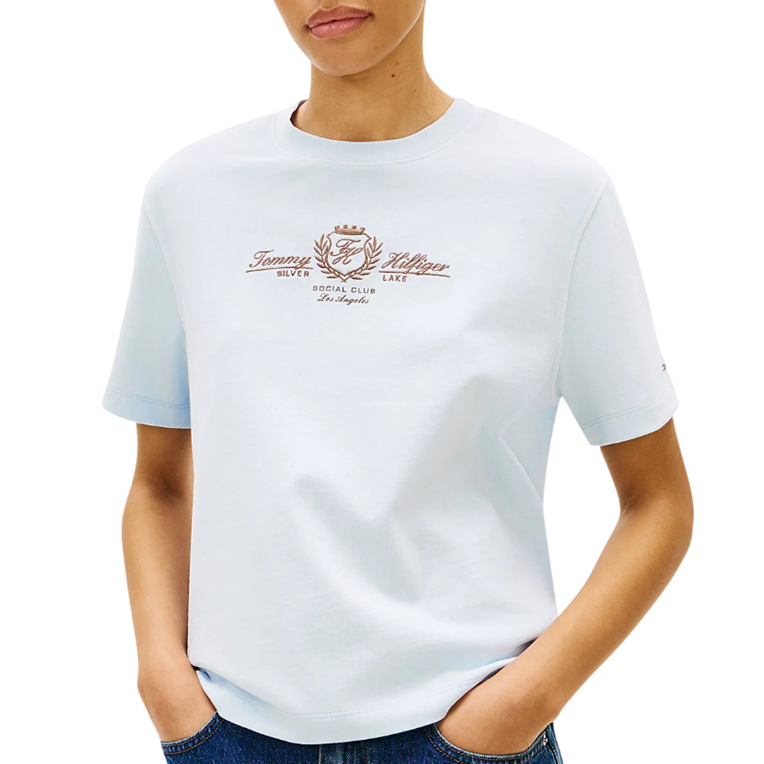 Aggiungi un tocco di stile college ai tuoi look con la raffinata T-shirt in jersey di puro cotone pesante, impreziosita dal logo con stemma ricamato sul petto. Caratteristiche principali • Jersey pesante di puro cotone • Girocollo • Nastro iconico all'interno del collo • Stemma TH ricamato sul petto • Logo Tommy Hilfiger in corsivo ricamato sul petto • Branding Tommy Hilfiger • Bandierina Tommy Hilfiger in metallo sulla manica Modello e vestibilità • Relaxed fit