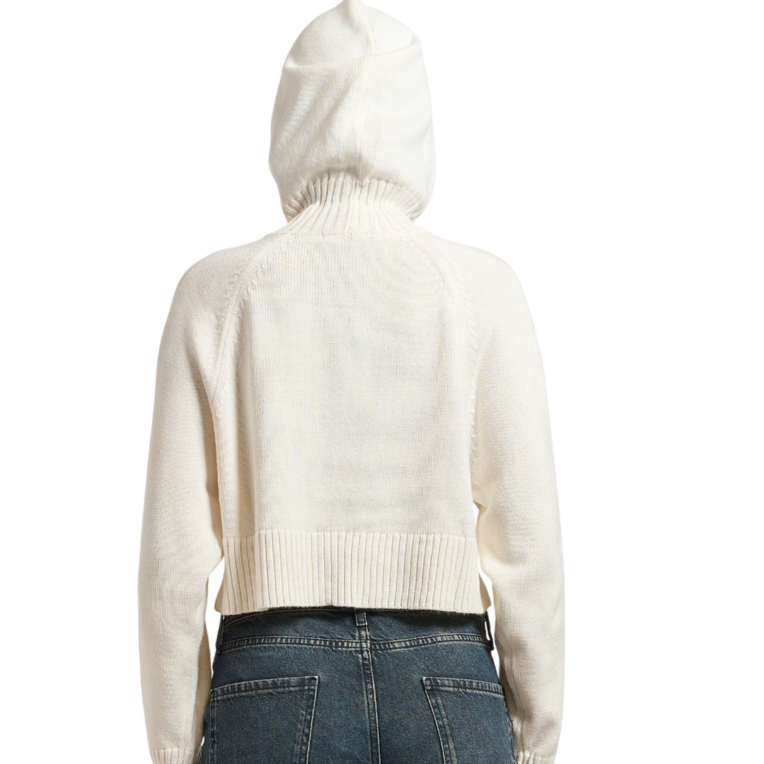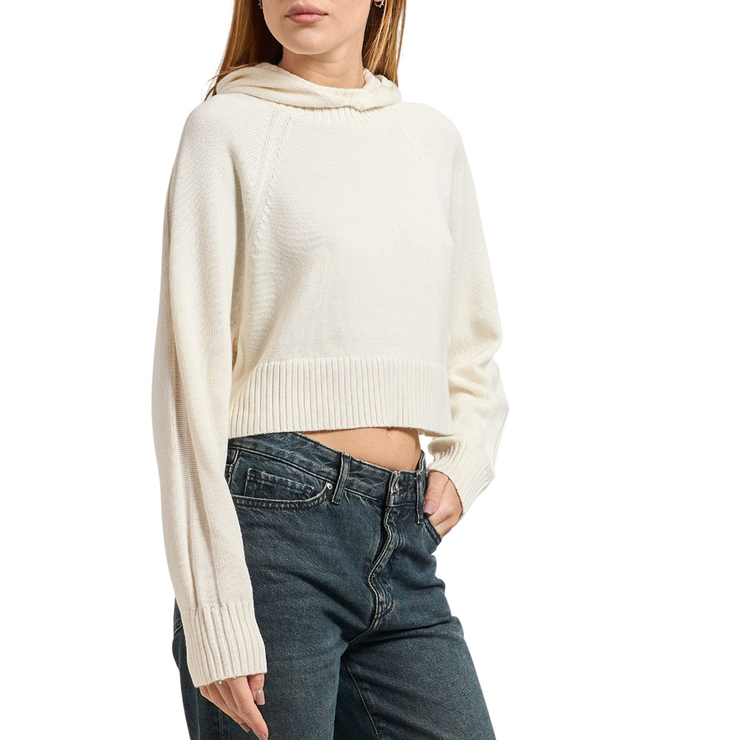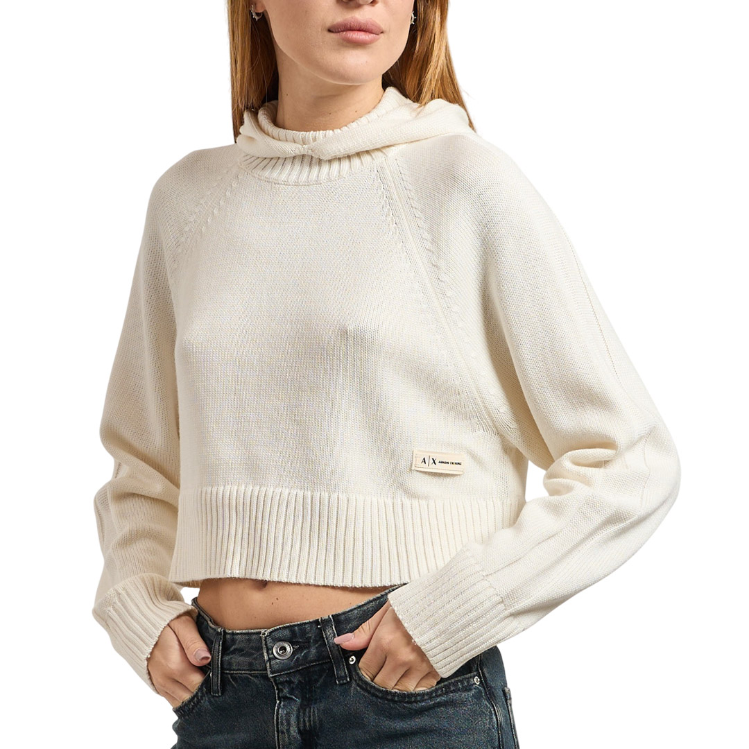 Maglione donna Armani Exchange in misto lana vergine dal taglio corto, cappuccio e con targhetta logato sull'orlo