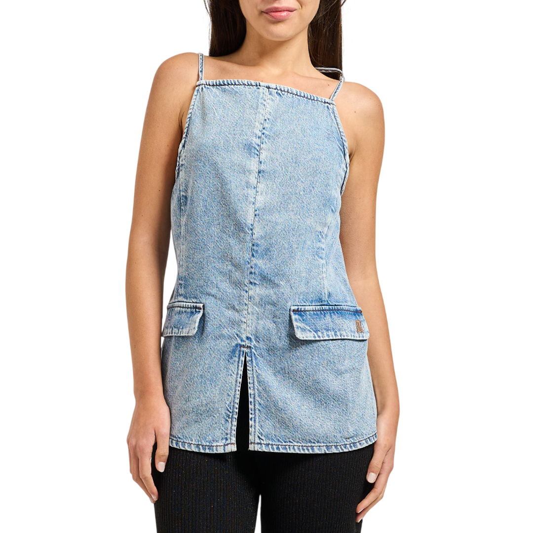 Top donna AX con spalline regolabili, tasche a patta sul davanti e un taglio centrale. Completamente aperto sul retro.