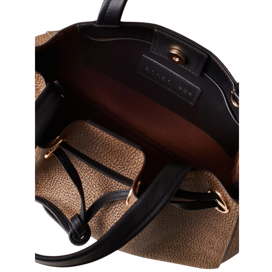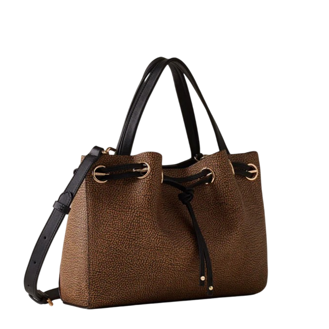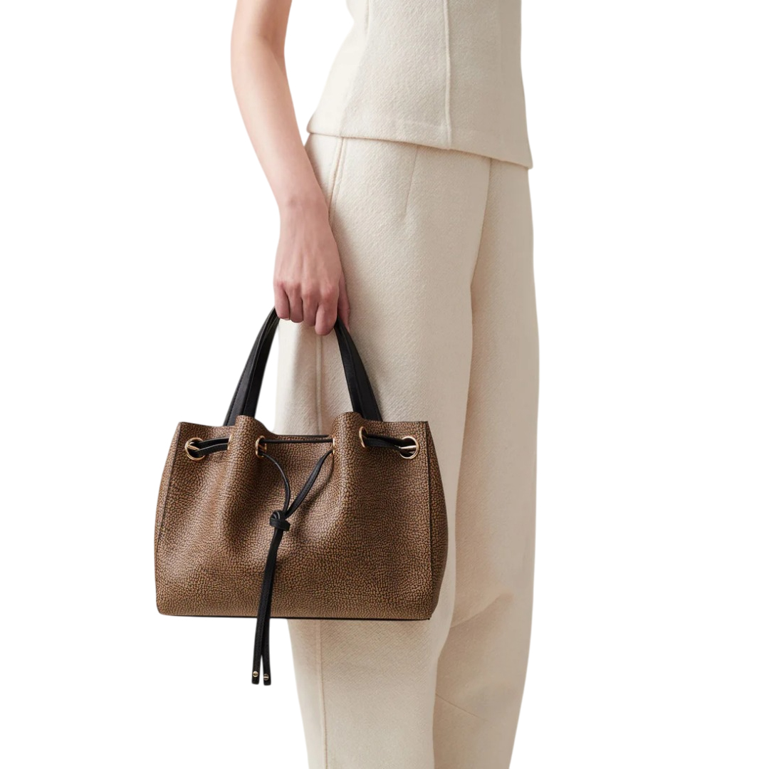 La vite, iconico simbolo di Borbonese, è protagonista della linea Marèe, dove le borse sono arricchite da morbide pieghe create da un effetto coulisse. Tela rivestita OP Dettagli di pelle di vitello Impugnatura a doppio manico Coulisse di pelle e anelli di metallo Chiusura con magnete Tracolla di pelle regolabile e removibile Fodera di tessuto effetto camoscio Interno con tasca aperta Metallerie Oro Chiaro Misura Medium Dimensioni ( cm ): 10x30,5x23