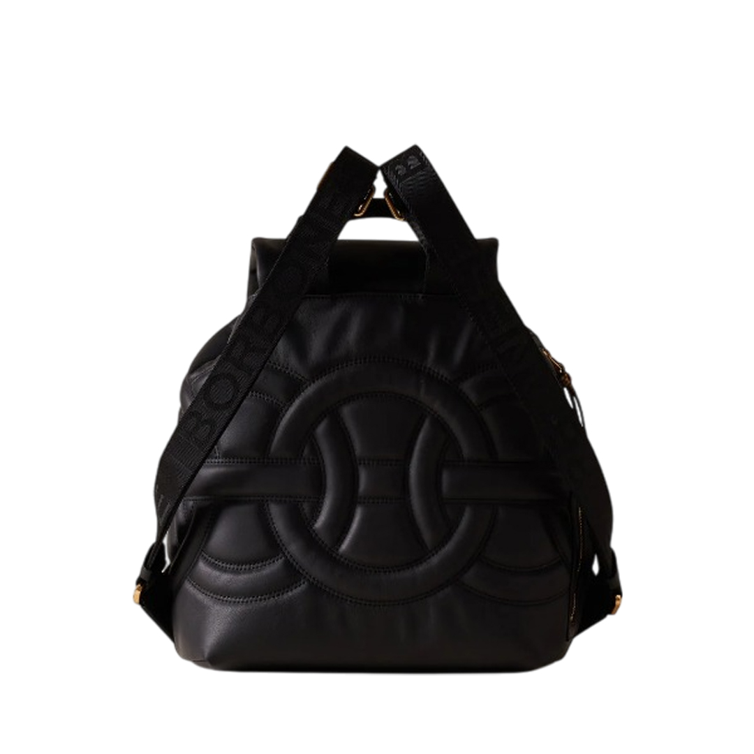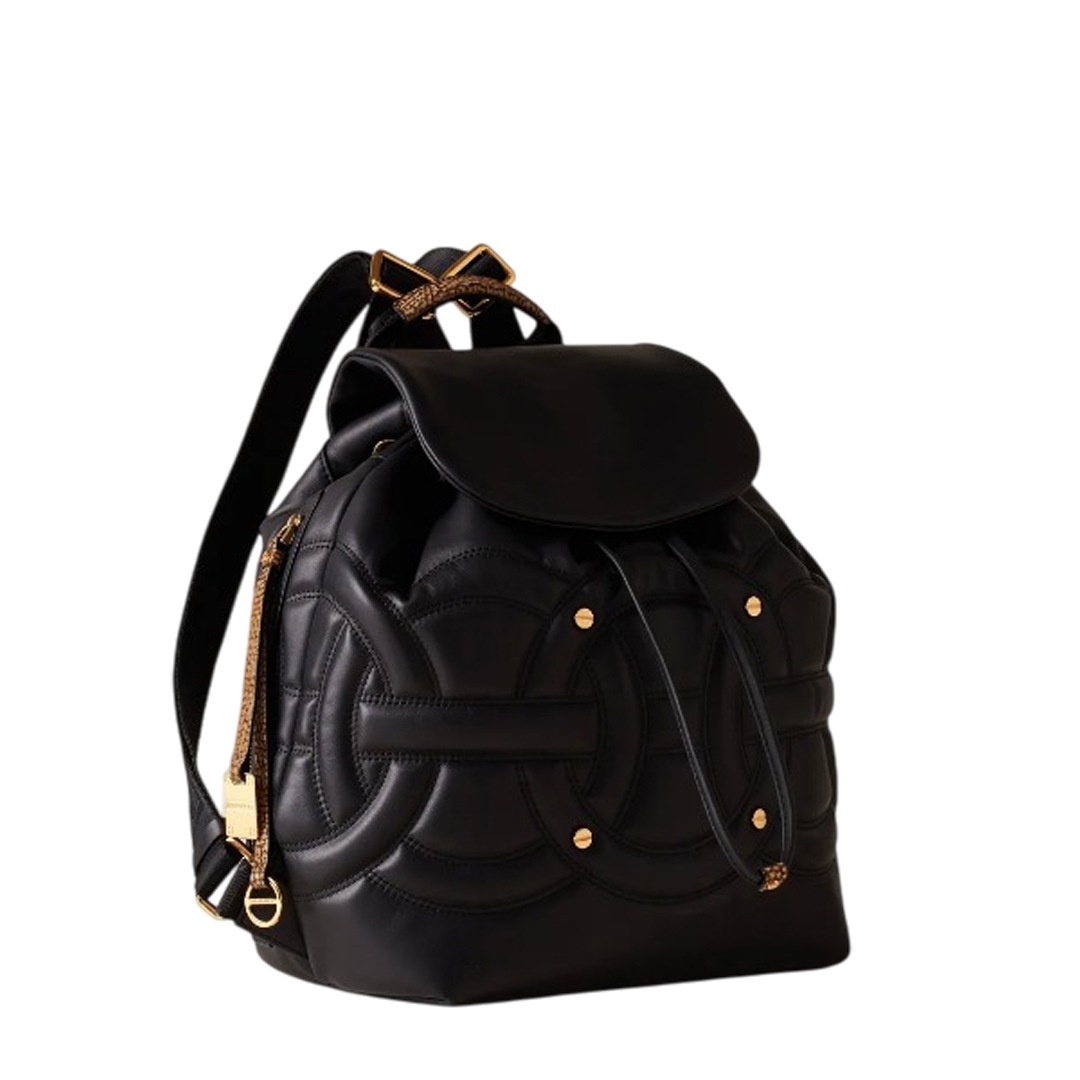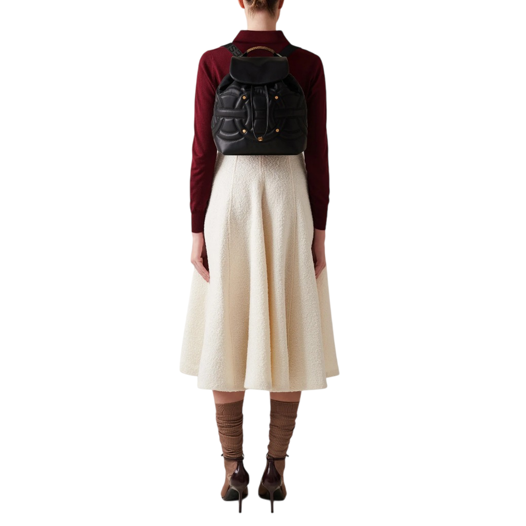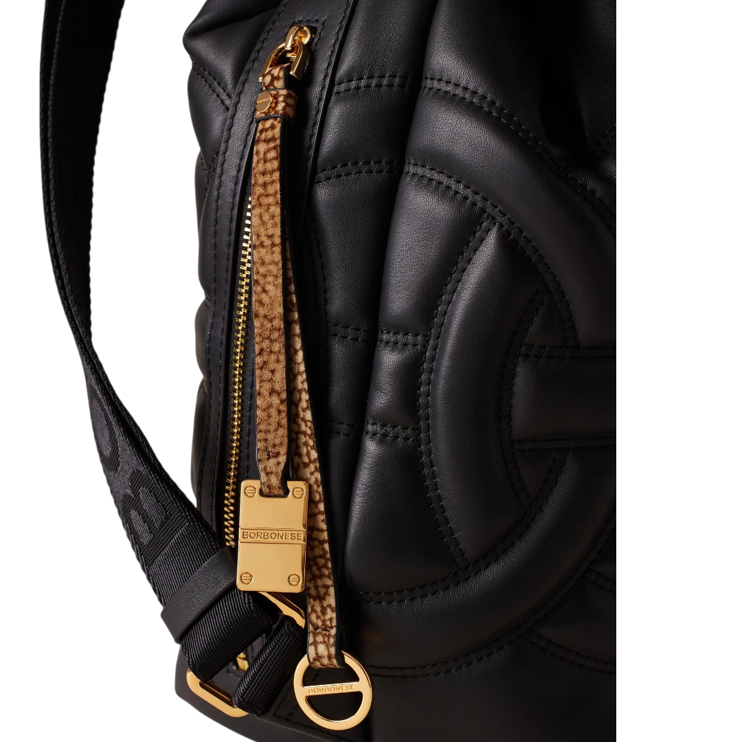 Vitello nappato matellasse’ con disegno vite Dettagli in Camoscio Op Fodera di tessuto jacquard riciclato Chiusura con coulisse e patta Tirazip in Camoscio Op con elementi decorativi a vite e placchetta logati Spallacci in nylon logato Metallerie oro Misura large dimensioni: 27x32x17