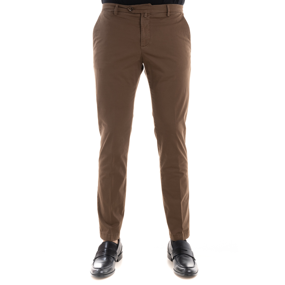 Pantalone Briglia in cotone rasatello, tasche a filo avanti e sul retro più taschino avanti, chiusua a zip più bottone in vita, vita bassa e gamba slim