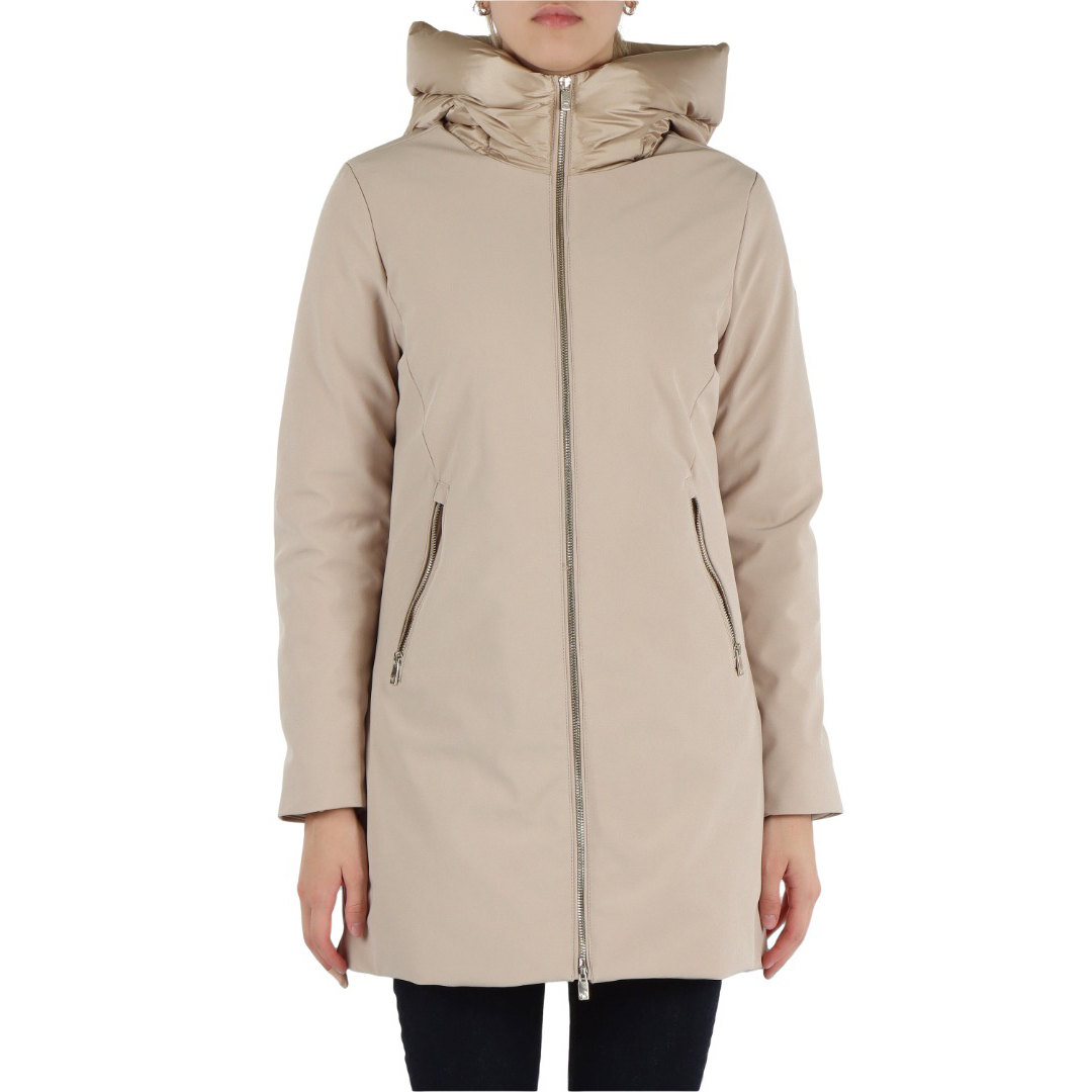 Giacca lunga nera da donna realizzata in tessuto softshell 3 layers con laminazione dry-tech ed imbottita in vera piuma 90/10. Il cappuccio realizzato in tessuto nylon cal effetto lucido e la zip oro donano al capo un aspetto femminile, elegante e confortevole. L’imbottitura in vera piuma garantisce performance termiche, funzionalità ed allo stesso tempo leggerezza. Il tessuto softshell è resistente all’acqua ed alle condizioni climatiche avverse, garantendo traspirabilità ed impermeabilità. – slim fit – interno giacca trapuntato in tessuto nylon cal – puller logati – zip oro – tasche con cerniera – logo rubber in tono sulla manica