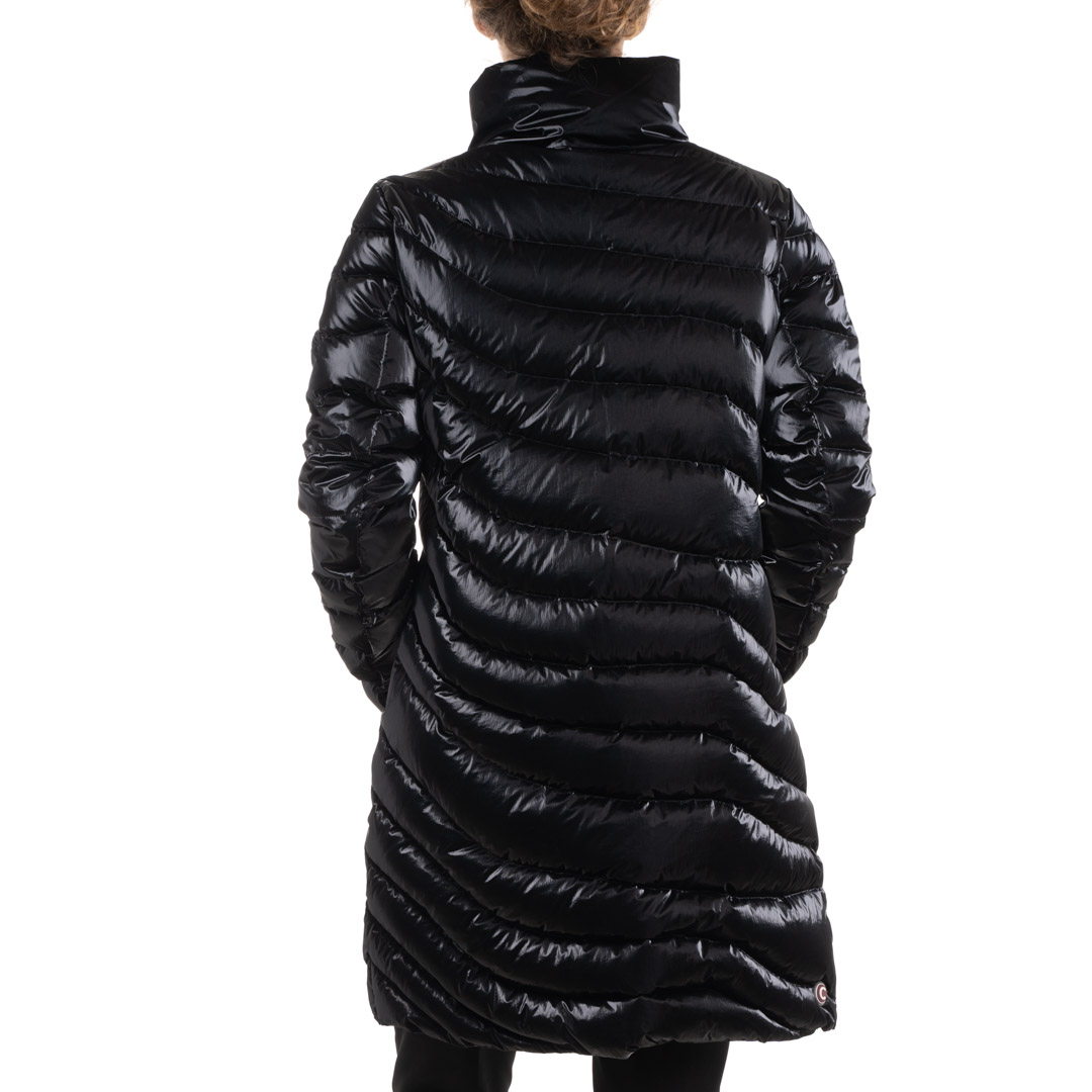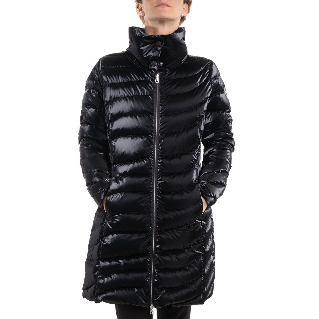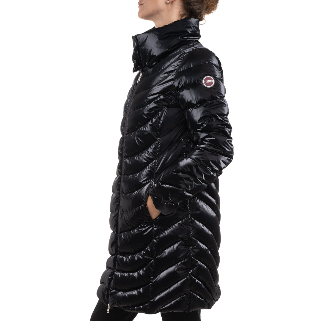 Piumino di lunghezza media Colmar dal tessuto cangiante. Impuntura obliqua. Chiusura con cerniera metallizzata a doppio cursore. Tasche laterali a filetto. Collo alto chiuso da due bottoni a pressione nascosti . Logo applicato sulla manica sinistra.