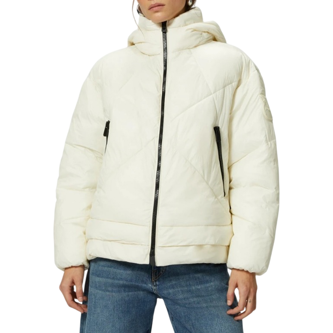 Giacca da donna con cappuccio fisso realizzata in tessuto laccato super lucido con trattamento idrorepellente. Imbottitura in piuma naturale. Linea sinuosa sottolineata dai trapunti a "V" sulla parte alta del capo che danno un'impronta personale a questo modello trendy e confortevole, sottolineando il punto vita. Grintoso e di carattere è dedicato alle trend-setter più freddolose. Vestibilità regular Peso invernale Chiusura con zip Tasche laterali con zip Cappuccio fisso con coulisse di regolazione Imbottitura in piuma naturale Trattamento idrorepellente Logo Colmar Originals applicato sulla manica sinistra