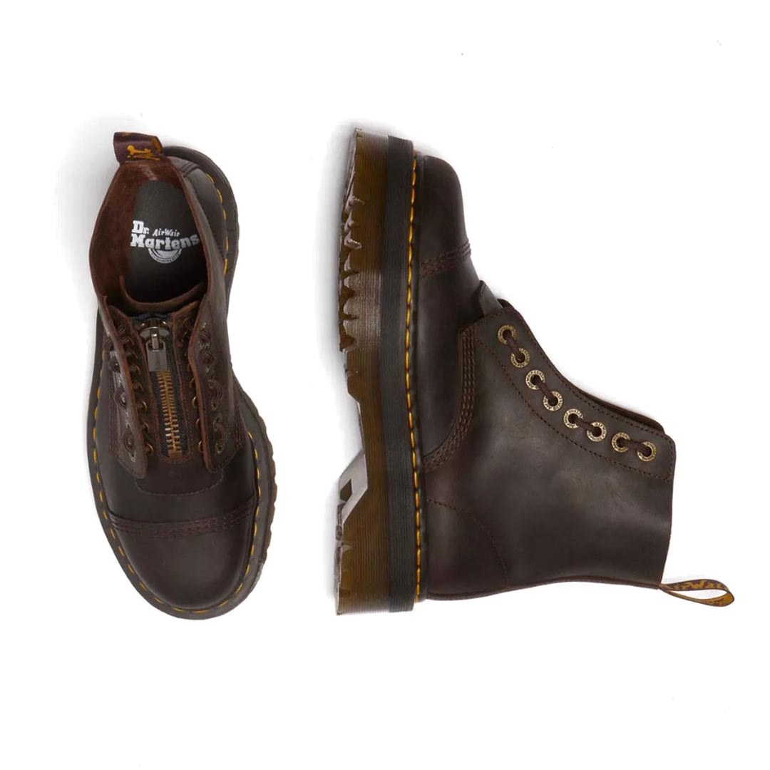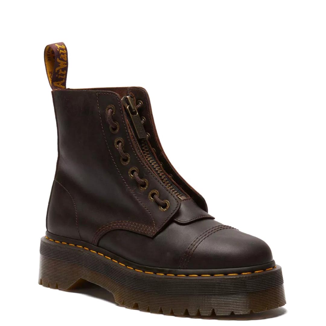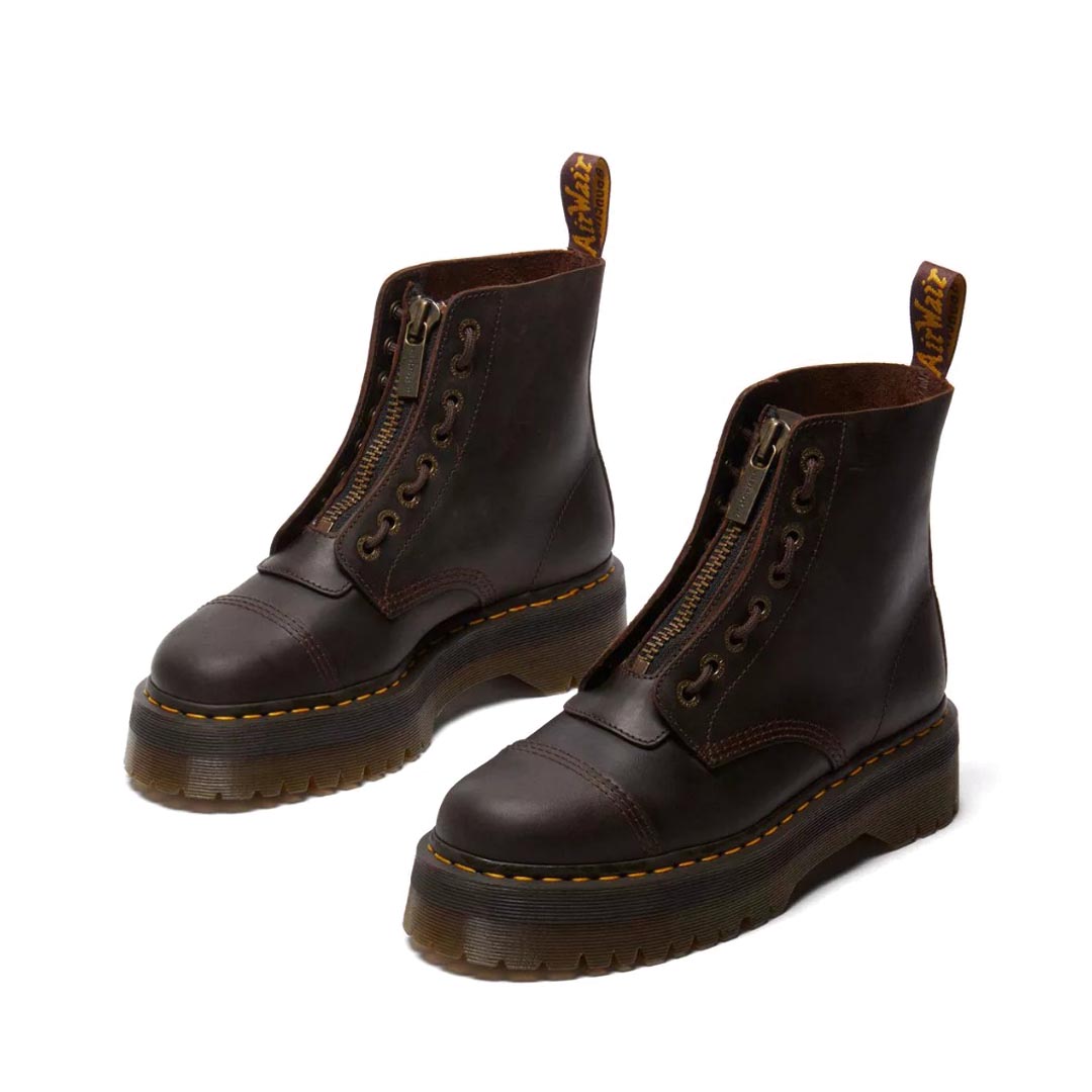 Uno stivale Sinclair in pelle Crazy Horse marrone che sembra aver vissuto già lunghe estati e affrontato centinaia di festival: un paio nuovo, ma con un look vissuto. La suola a motivo scanalato è ulteriormente rinforzata da cuciture gialle e marroni, gli stessi colori che ritroverai nella linguetta AirWair sul tallone. Per garantirti il massimo della versatilità, sta a te scegliere se indossare questo paio con la sua classica cerniera frontale o no. Lascerai il segno in ogni caso. Crazy Horse è una pelle robusta e testurizzata dall'aspetto consumato.