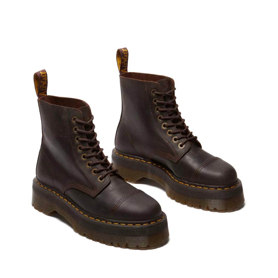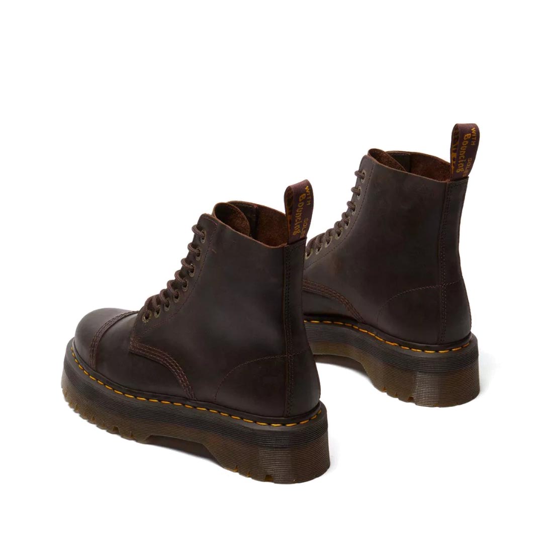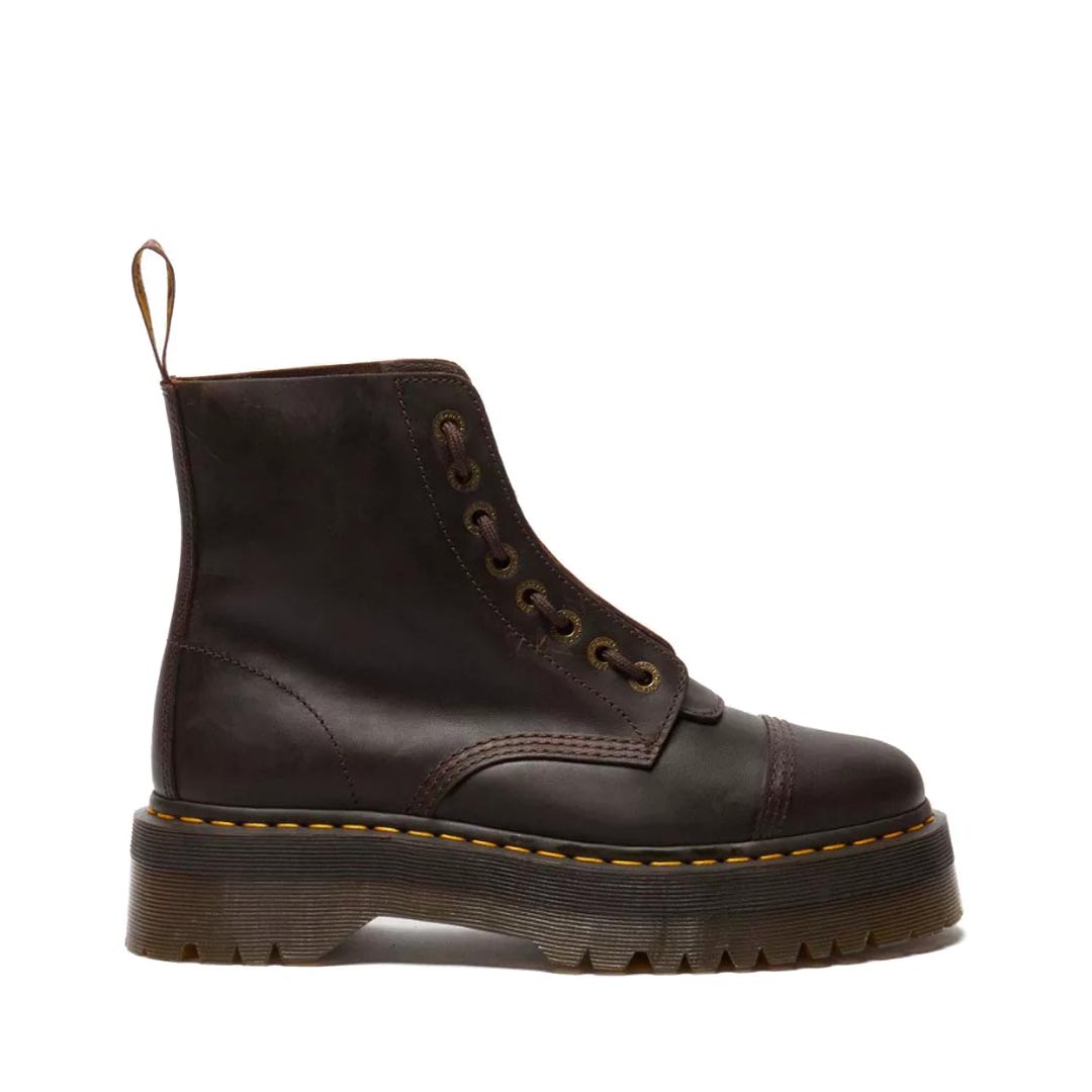 Uno stivale Sinclair in pelle Crazy Horse marrone che sembra aver vissuto già lunghe estati e affrontato centinaia di festival: un paio nuovo, ma con un look vissuto. La suola a motivo scanalato è ulteriormente rinforzata da cuciture gialle e marroni, gli stessi colori che ritroverai nella linguetta AirWair sul tallone. Per garantirti il massimo della versatilità, sta a te scegliere se indossare questo paio con la sua classica cerniera frontale o no. Lascerai il segno in ogni caso. Crazy Horse è una pelle robusta e testurizzata dall'aspetto consumato.