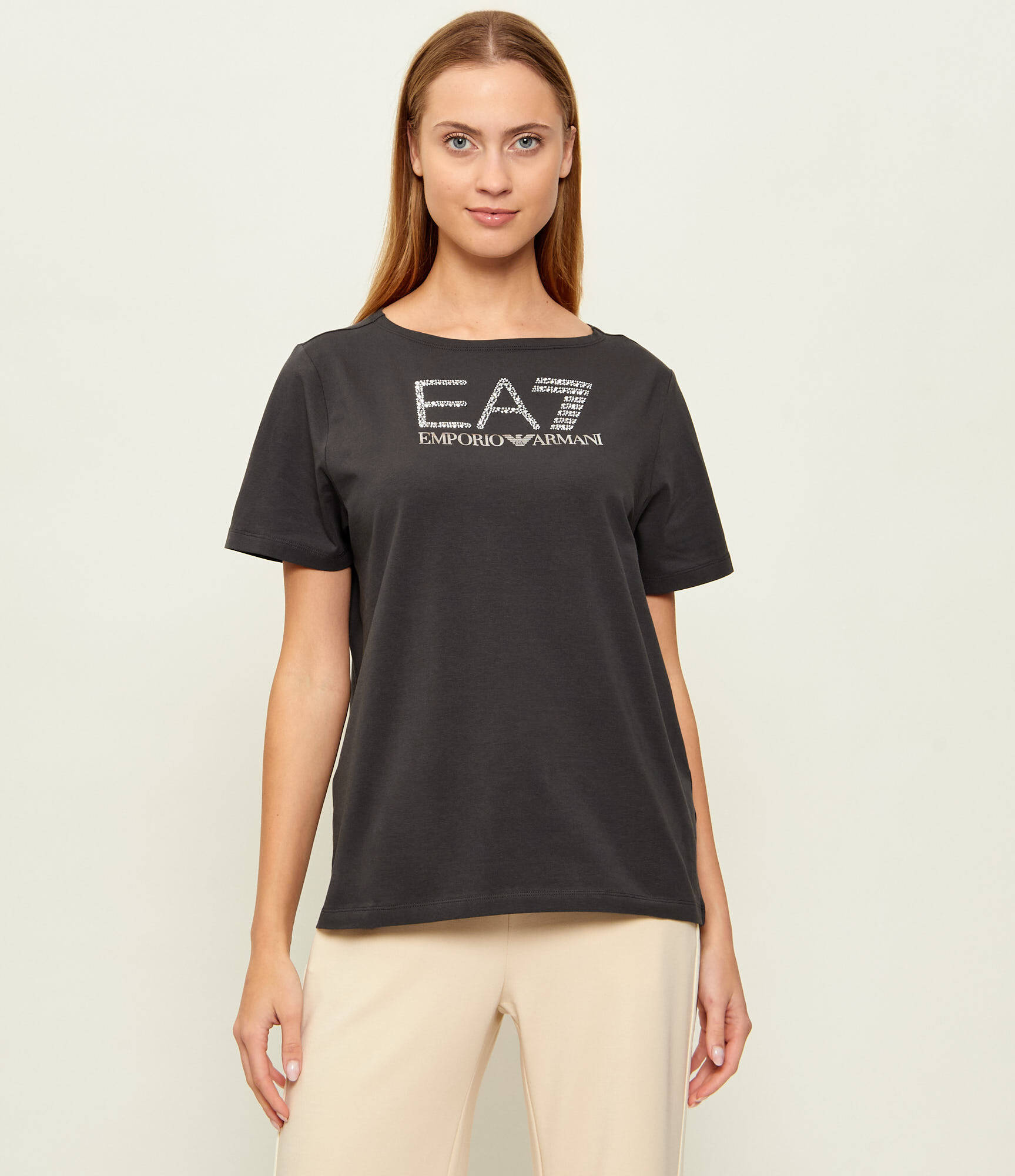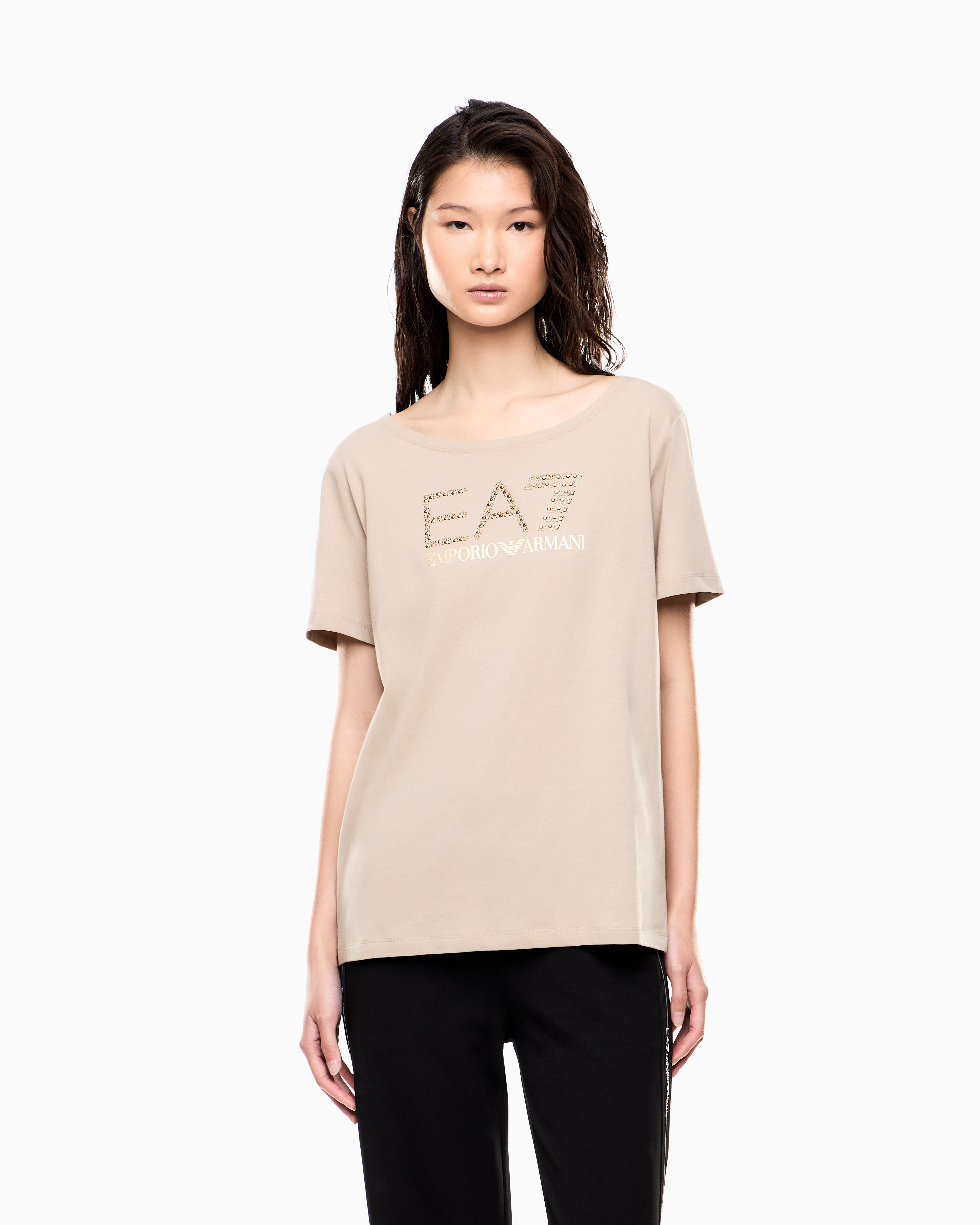 T-shirt girocollo,realizzata in jersey di cotone elasticizzato. Il modello è impreziosito dal logo EA7 realizzato con micro borchie che donano un touch luminoso al capo. Ideale per l'allenamento o per un look casual e rilassato.