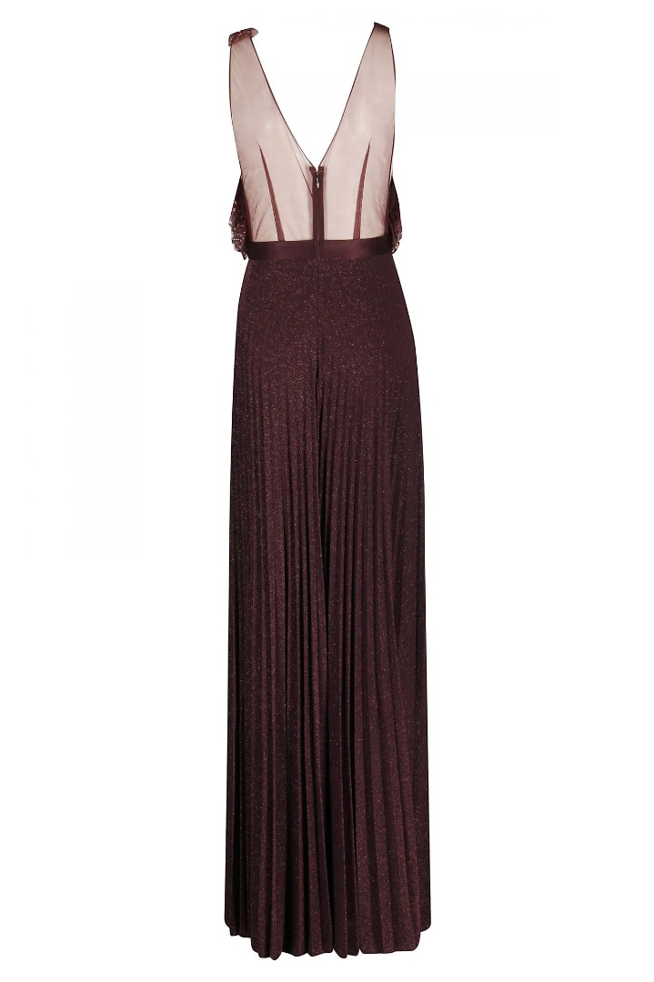 Abito da sera dalla vestibilità slim. Il vestito è smanicato e si distingue per il top con piccole balze in tulle, illuminate da cristalli ricamati a mano. La gonna in jersey ha pieghettatura plissé soleil che sorprende con un profondo spacco. Dettaglio gioiello con logo e strass a impreziosire il punto vita. Dettaglio in metallo dorato con logo e strass Zip invisibile sul fianco