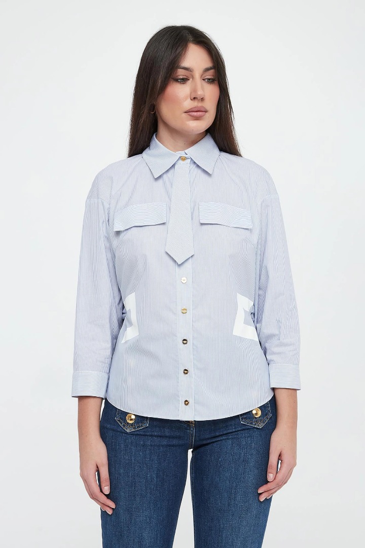 Camicia con maniche a 3/4 bianca con motivo a righe azzurre. Essenziale ed elegante, questa camicia è realizzata in 100% cotone, ideale per garantire freschezza e comfort durante la stagione primaverile. Il colore dona luminosità e raffinatezza al look, mentre la vestibilità slim fit valorizza la silhouette con una linea pulita e femminile.