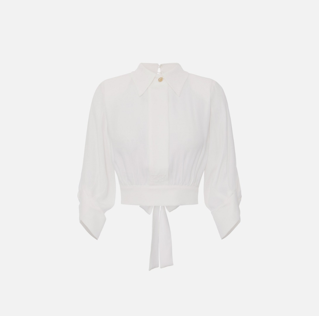 Camicia in georgette con colletto classico e maniche ¾. Ha polsi a mandorla che donano movimento e cannoncino con logo ricamato in tono. Il retro rivela un'apertura al centro e un'elegante fusciacca da annodare. Vestibilità regular Chiusura nascosta Ricamo con logo