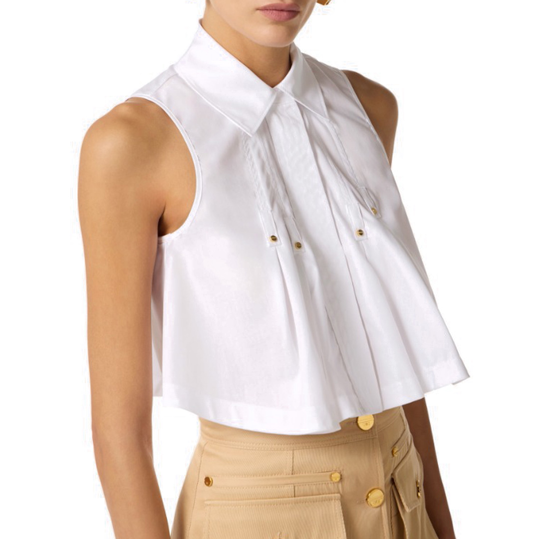 Camicia smanicata in popeline di cotone con colletto alto. Si distingue per i motivi di pieghe sul davanti, impreziosite da rivetti in metallo dorato. Il retro è arricchito dalla martingala con dettaglio logo. Vestibilità regular. Dettaglio in metallo dorato con logo