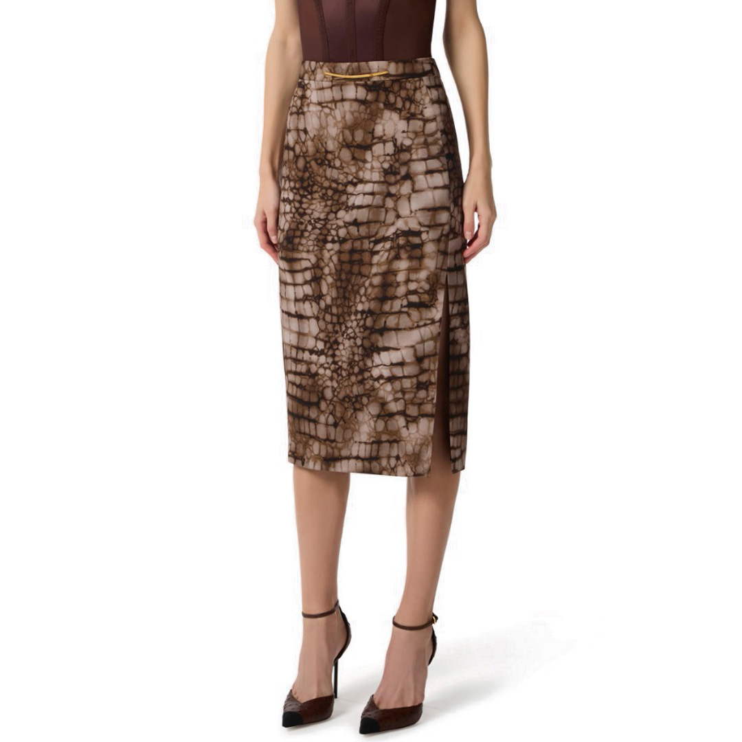 Gonna midi in jersey leggero con spacco laterale. Protagonista è la stampa all-over a tema alligatore, ispirata a forme e geometrie naturali. La vita è impreziosita dalla placca in metallo dorato con logo. Vestibilità regular. Fodera in raso monogram Accessorio in metallo dorato con logo Zip invisibile sul retro