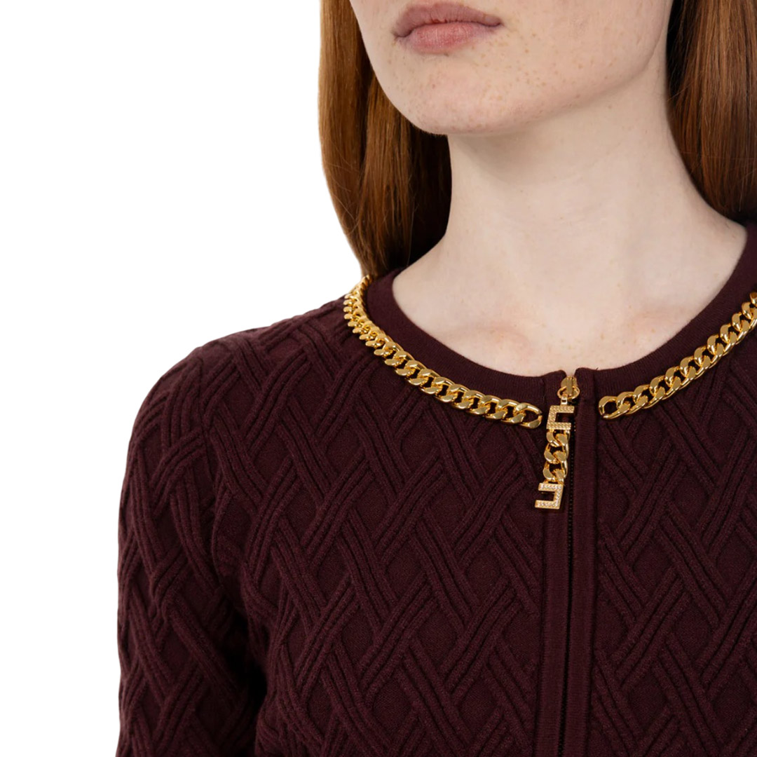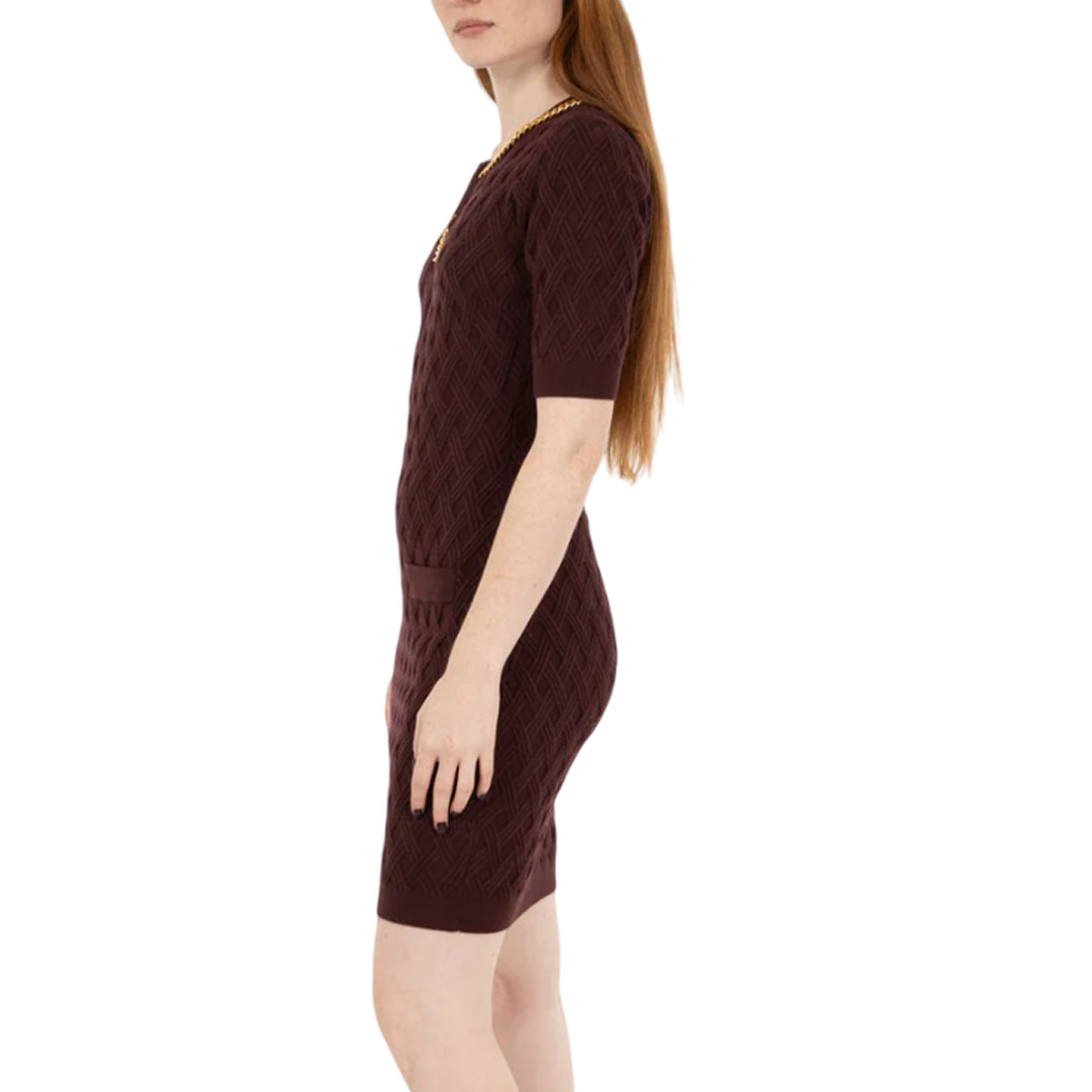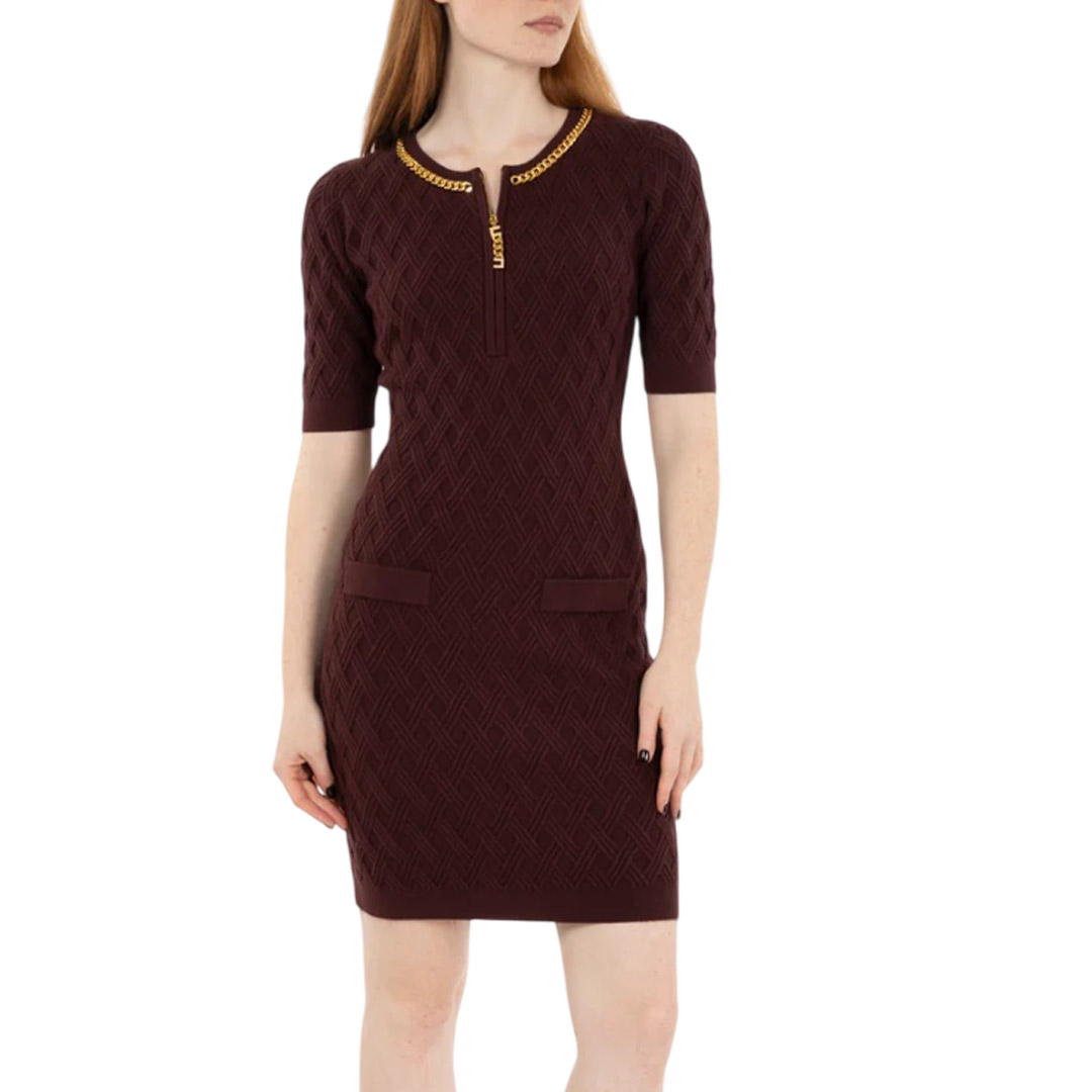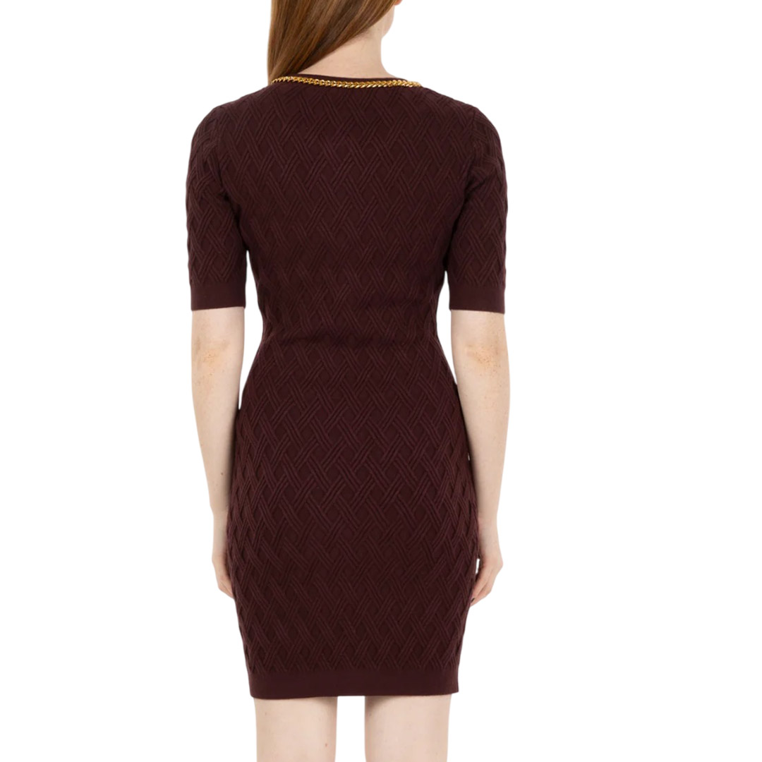 Mini abito in maglia dalla vestibilità aderente. Il vestito ha girocollo, maniche sopra al gomito e si distingue per l'elaborata lavorazione 3D che crea un disegno geometrico a rombi su tutta la lunghezza. Impreziosito dalla catena groumette, ha scollo con zip e tirazip gioiello con logo. Dettaglio gioiello in metallo dorato Zip con tirazip gioiello Filetti sul davanti