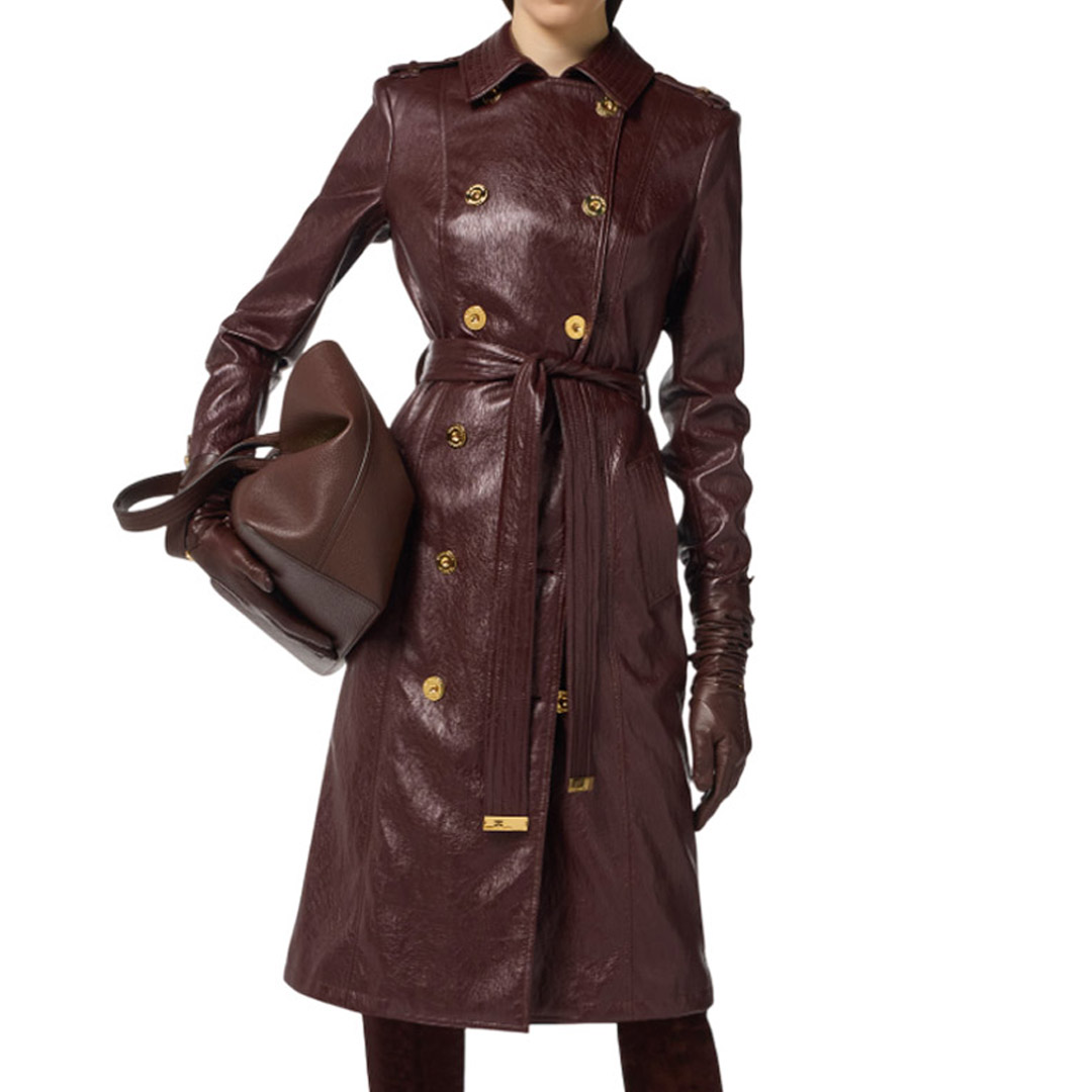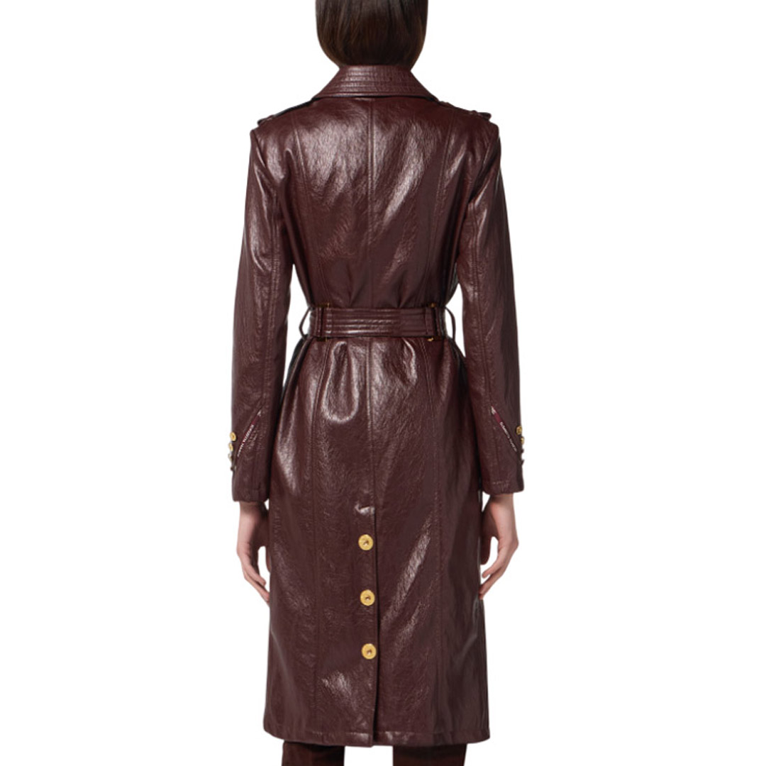 Trench realizzato in materiale sintetico effetto pelle con texture craquelé. Il capo presenta spalle strutturate, doppiopetto ed è illuminato da bottoni e mostrine in metallo dorato. Le maniche sono definite da nastri asimmetrici con logo. La cintura coordinata sottolinea il punto vita. Spalline imbottite Fodera in raso monogram Bottoni in metallo dorato con logo Tasche a filetto