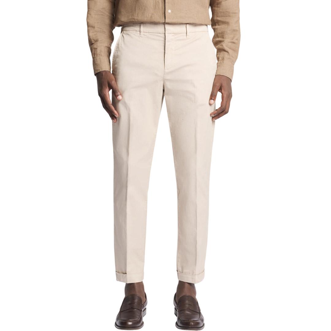 Pantaloni capri slim fit in gabardine stretch tinti in capo, con fondo risvoltato. Caratterizzati da tasche anteriori oblique, taschino portamonete e tasche posteriori a filetto con bottone, presentano una chiusura con zip e bottone. Il modello è arricchito dall'etichetta personalizzata Fay sul retro e un fondo risvoltato. Made in Italy Fitting: slim