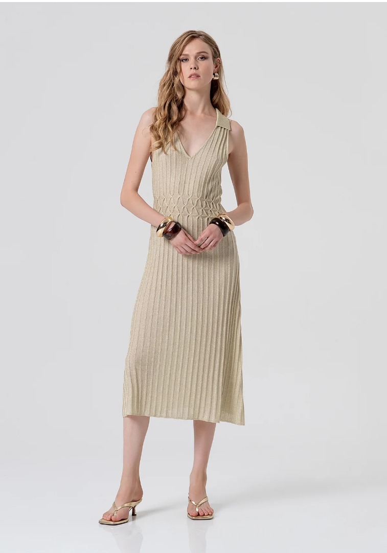 Abito senza maniche midi in maglia con lurex, scollo a V con colletto, e con gonna svasata.