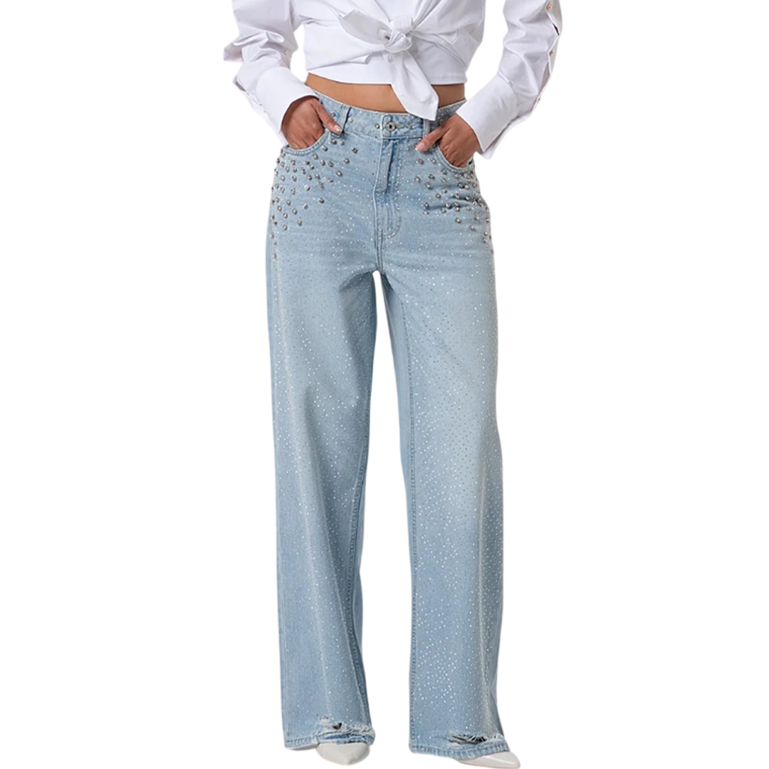 Pantalone flare a palazzo in fantasia, vita regolare, tasche alla francese, e con fondo ampio.