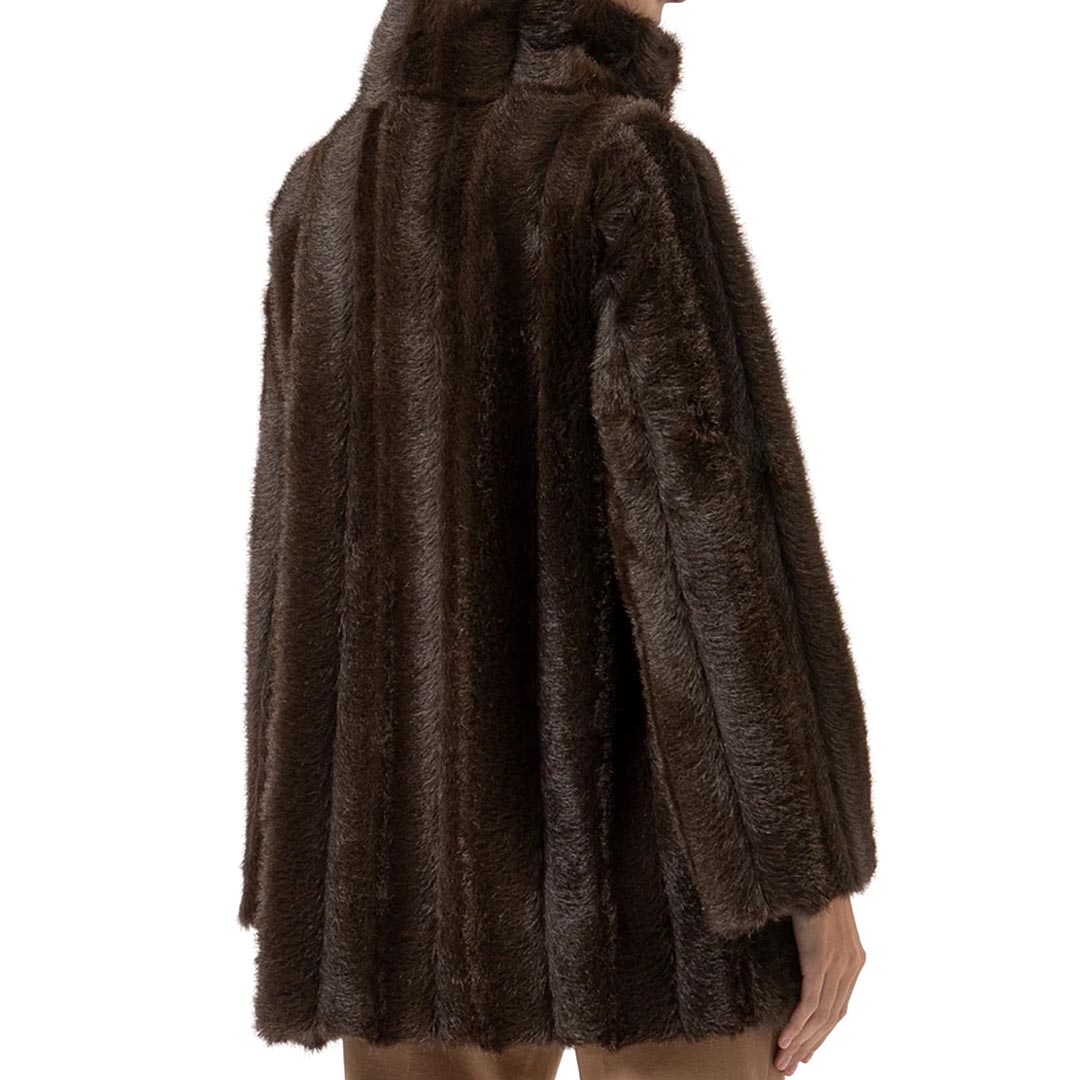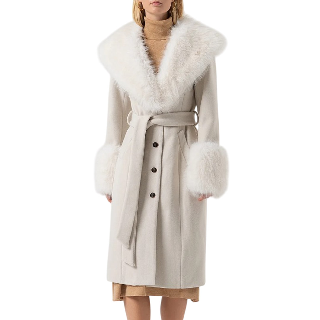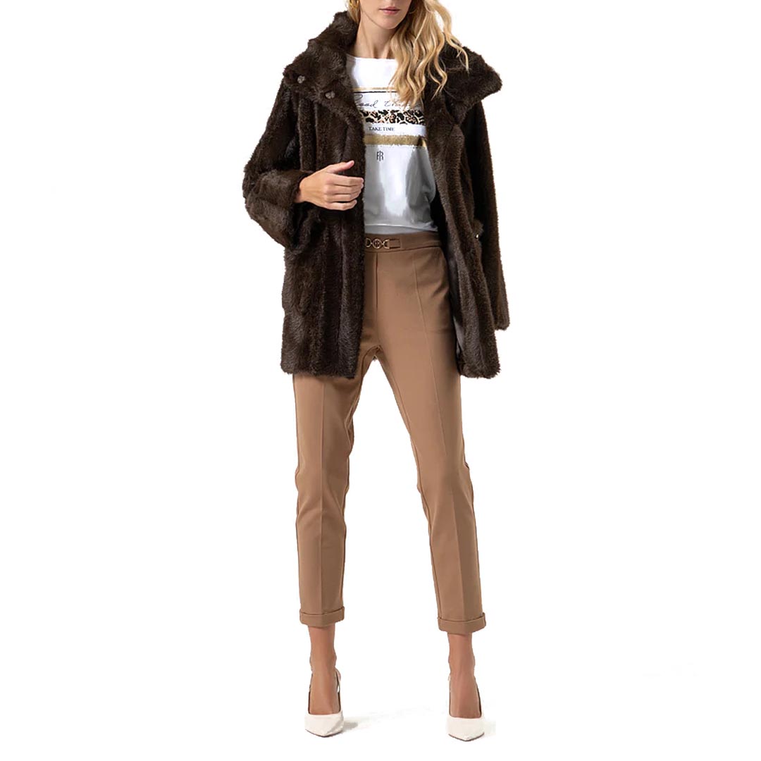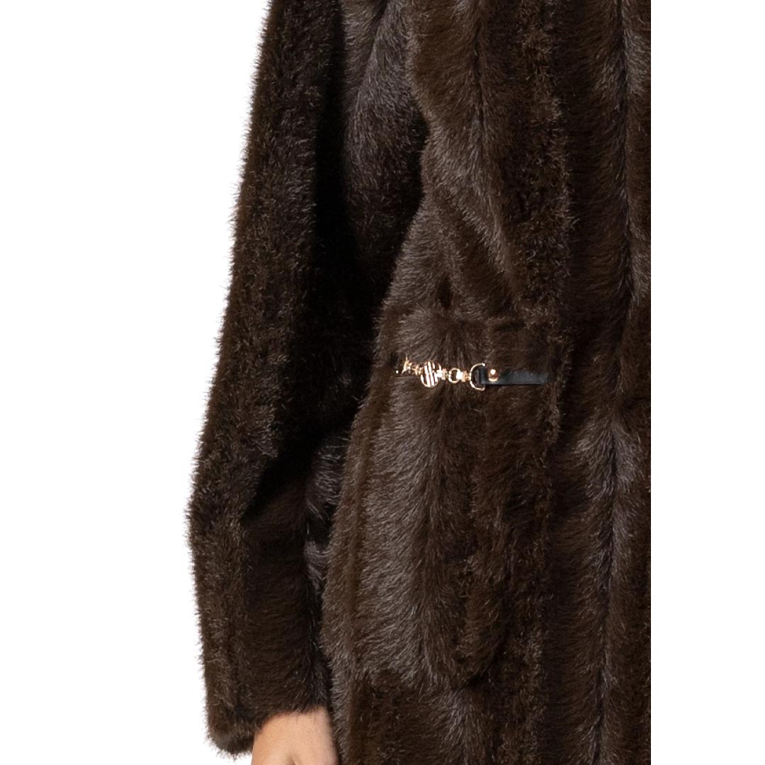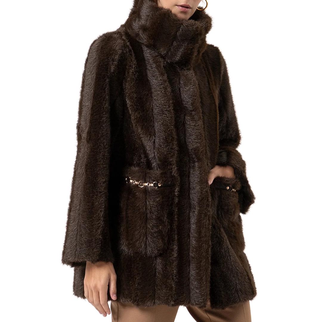 Giacca loose lunga, pelliccia finta, collo alto, apertura centrale, tasche a toppa con accessorio metallico, e con maniche lunghe.