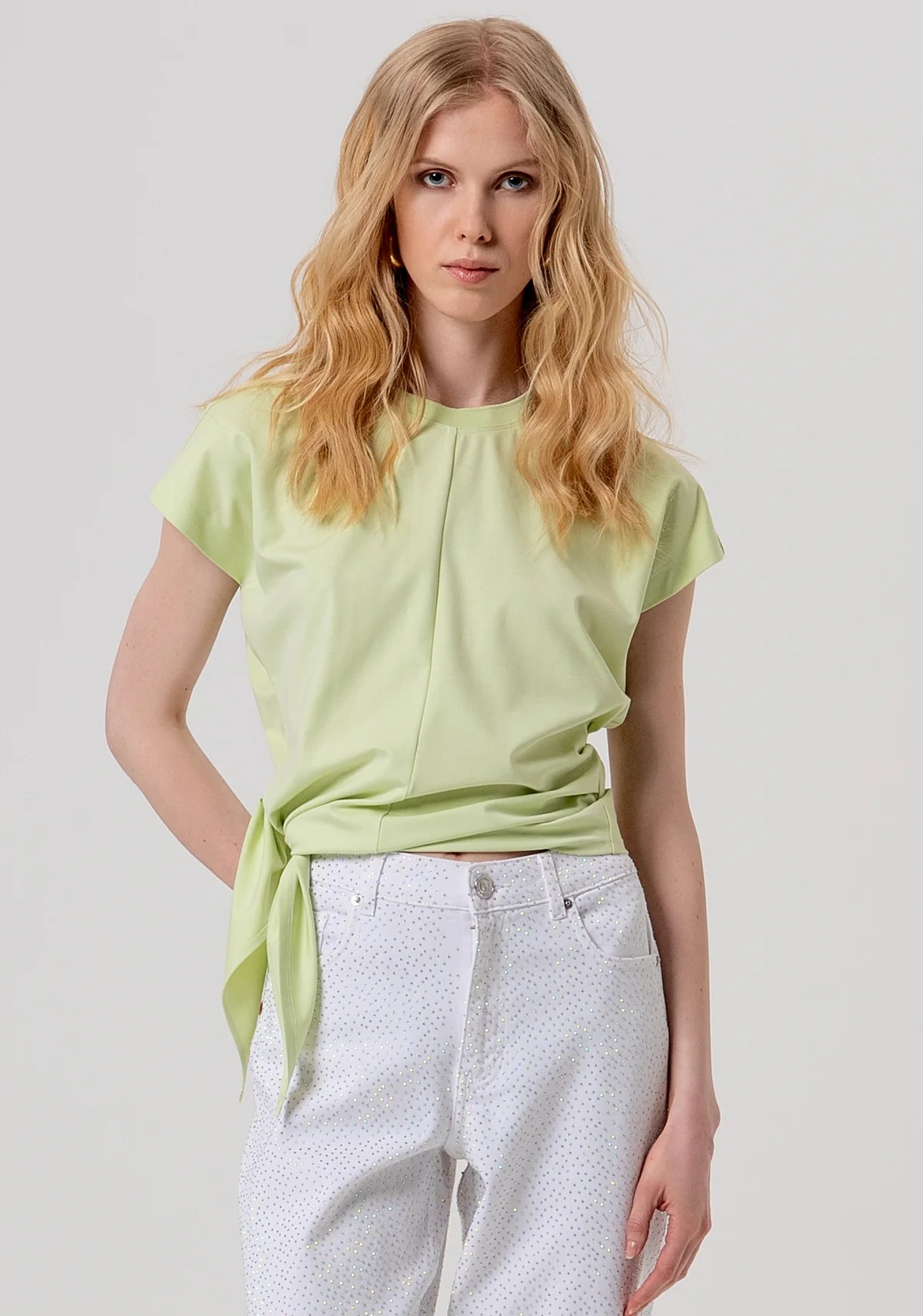 T-shirt cropped in jersey, girocollo, nodo laterale, e con maniche corte.
