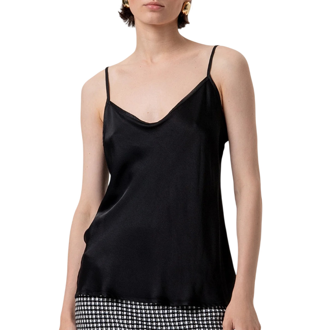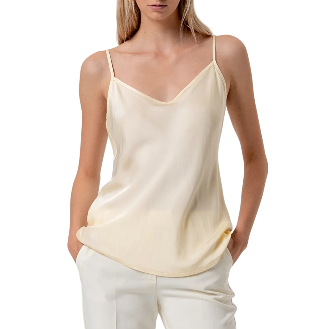 Top senza maniche in raso di viscosa, scollo a V, e con bretelline sottili.